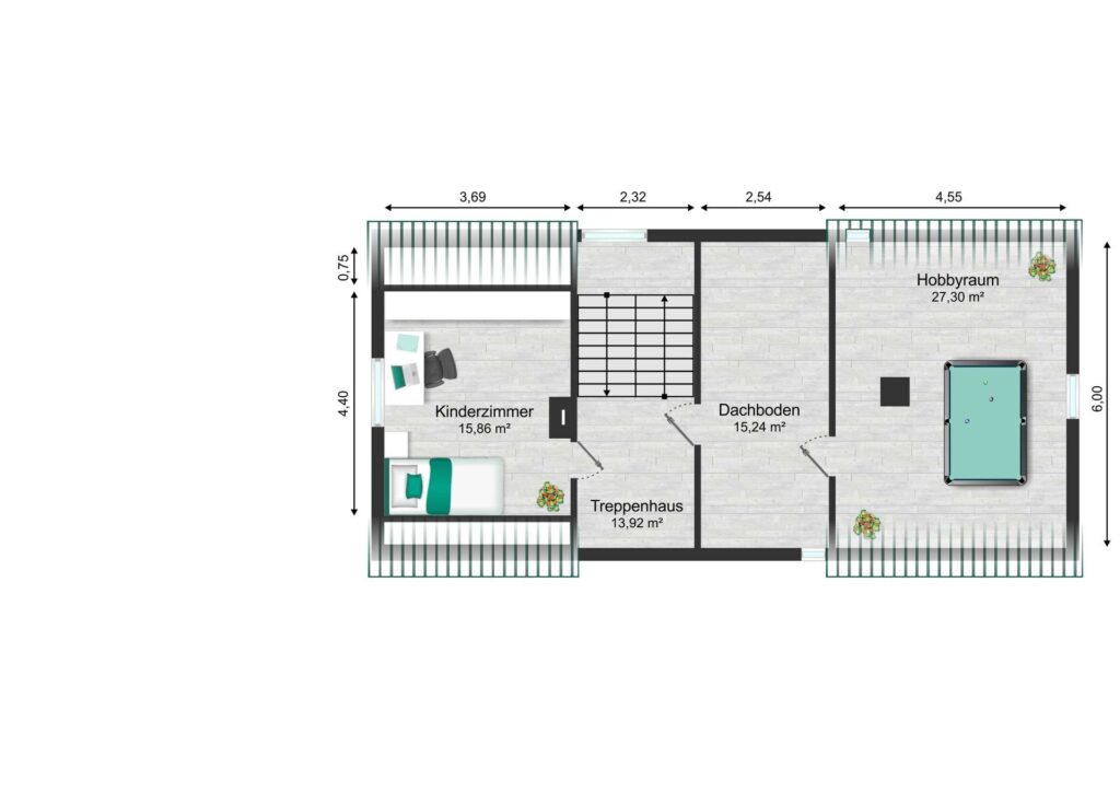 Im Dachgeschoss warten ein Hobbyraum und ein weiteres Zimmer auf neue Nutzungsideen – eine kleine Ausbaureserve ist ebenfalls vorhanden.