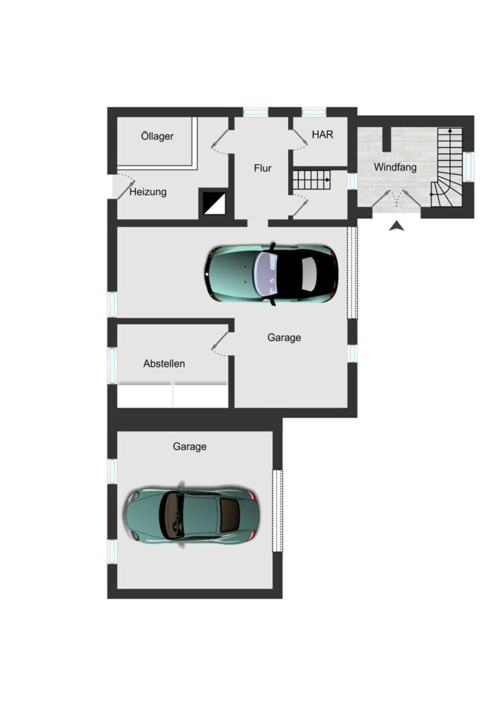Im Erdgeschoss empfängt Sie der Eingangsbereich mit direktem Zugang zu einer der großen Garagen, welche Werkstatt-Charakter haben – eine davon verfügt über eine Arbeitsgrube. Zudem finden Sie hier einen Hauswirtschaftsraum sowie den Heizungsraum mit Zugang zum Keller. Die großzügigen Garagen bieten nicht nur ausreichend Stellplatz für Fahrzeuge, sondern auch viel Platz für Werkzeuge und Lagermöglichkeiten. Zwei weitere Stellplätze befinden sich vor dem Haus unter dem Car-Port.