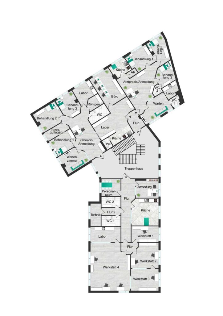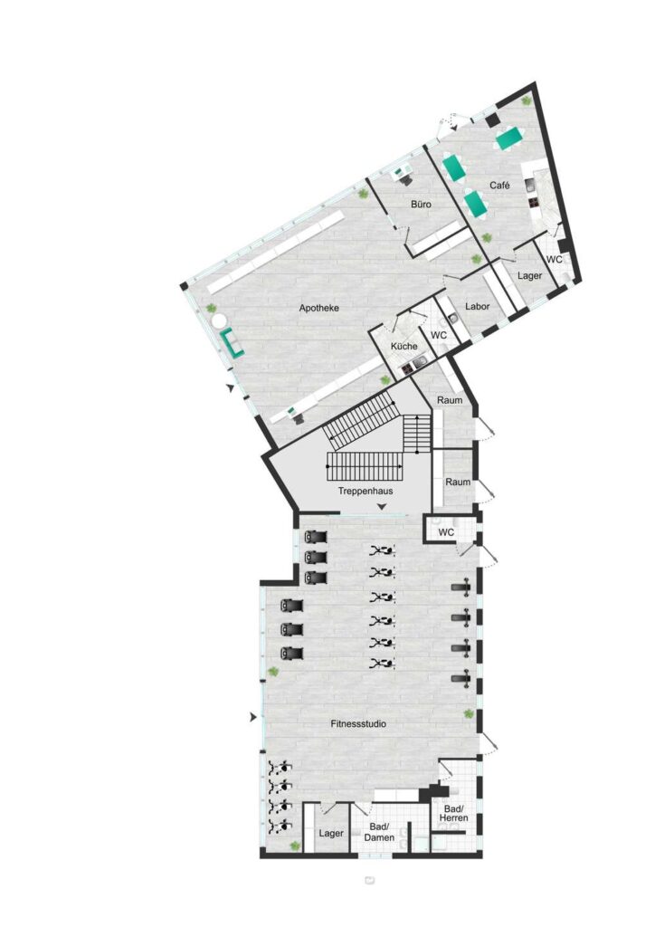 – einem Geschäftshaus mit 11 Gewerbeeinheiten auf 1.200 m² Fläche, Baujahr 1993, welches Ärzte, Apotheke, zahntechnisches Labor, Gastronomie, Fitnessstudio, Gesundheit/Pflege und Büros beherbergt mit großem angrenzendem Mietparkplatz