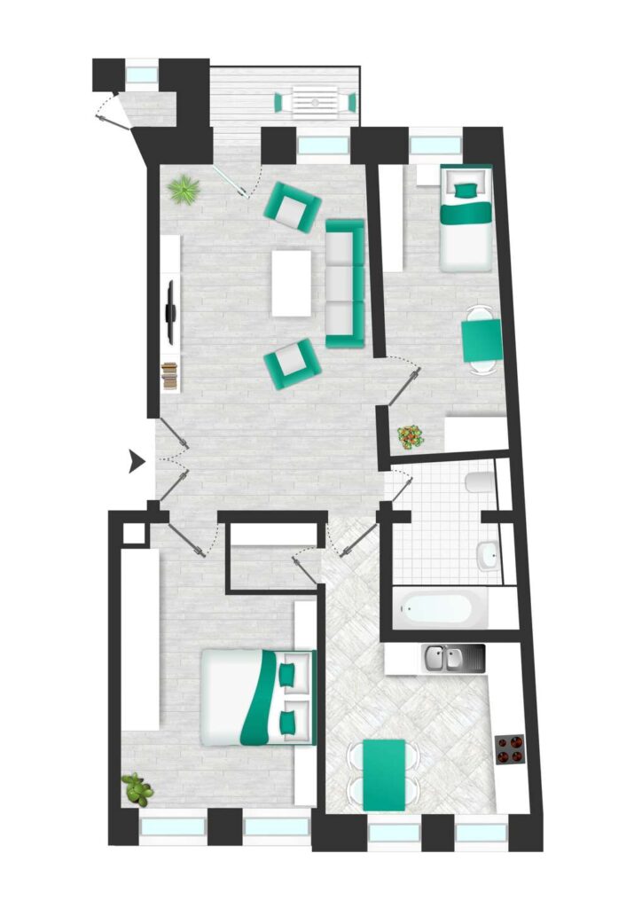 Die Küche geht vom Flur ab und bietet ausreichend Platz für einen gemütlichen Essbereich. Praktisch: Eine Tür führt von der Küche in die separate Abstellkammer – ideal für Vorräte oder Haushaltsutensilien. Das Badezimmer ist ebenfalls über den Flur zugänglich und mit einem Oberlicht ausgestattet, das für angenehmes Tageslicht sorgt. Ausgestattet mit Badewanne, Waschtisch und WC erfüllt es alle Ansprüche an modernes Wohnen.