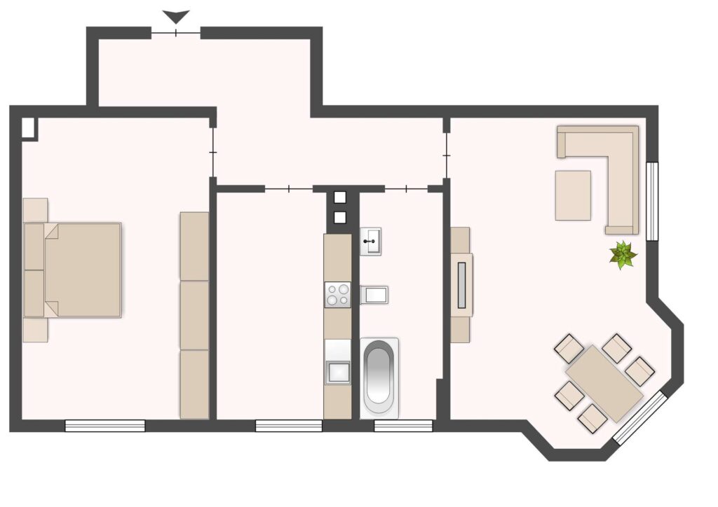 Die Wohnung überzeugt durch einen klugen Grundriss. Vom zentralen Flur, der alle Räume miteinander verbindet, gelangen Sie direkt in das helle Wohnzimmer, das durch große Fenster und einer Erkerform für viel Tageslicht sorgt. Das Schlafzimmer ist separat und lässt sich rückseitig, ruhig gelegen nutzen. Das Badezimmer, modern und funktional gestaltet, bietet eine optimale Raumaufteilung, während die separat gelegene Küche ideal für Kochbegeisterte ist. Die Küche ist mit einer Einbauküche ausgestattet. Alle Räume sind praktisch angeordnet und lassen vielfältige Einrichtungsmöglichkeiten zu.