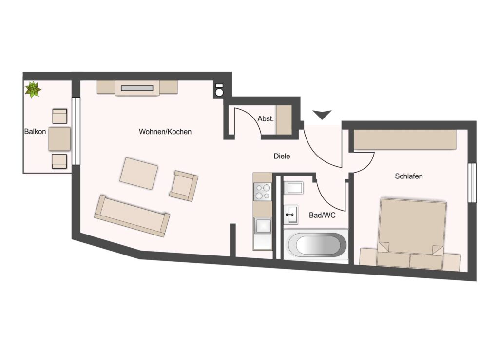 Das Herzstück der Wohnung ist das helle Wohnzimmer mit Zugang zum West-Balkon, der einen entspannten Blick in den ruhigen Innenhof bietet. Die angrenzende Einbauküche ist bereits vollständig ausgestattet. Das Schlafzimmer ist gut geschnitten und bietet ausreichend Platz für einen Kleiderschrank und ein Doppelbett.