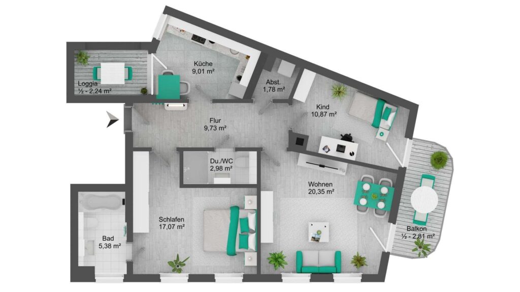 Das geräumige Schlafzimmer verfügt über ein Tageslichtbad en suite mit Badewanne. Zusätzlich steht ein separates Duschbad mit ebenerdiger Dusche zur Verfügung. Gegenüber dem Schlafzimmer befindet sich die Küche, die direkten Zugang zur ruhig ausgerichteten Loggia bietet. Die beiden weiteren Zimmer am Ende des Flures haben jeweils Zugang zum Süd-Ost-Balkon und profitieren von viel Tageslicht.