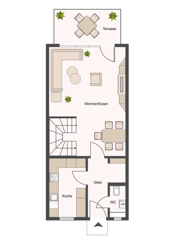 Das Haus erstreckt sich über drei Etagen und bietet auf ca. 112 m² Wohnfläche vier gut geschnittene Zimmer. Im Erdgeschoss empfängt Sie eine Diele mit Garderobennische, ergänzt durch ein Gäste-WC mit Tageslicht und eine separate Küche mit Fenster. Herzstück ist der helle Wohn- und Essbereich mit großer Fensterfront und direktem Zugang zum liebevoll angelegten Garten mit Terrasse.