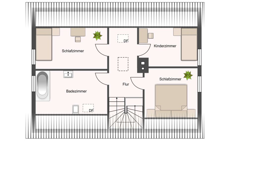 Im Obergeschoss stehen Ihnen drei weitere gut geschnittene Zimmer zur Verfügung, die flexibel als Schlaf-, Kinder- oder Arbeitszimmer genutzt werden können. Auch auf dieser Etage ist der Flur großzügig gestaltet und ermöglicht über eine Bodenluke den Zugang zum Dachboden, der weitere Abstellmöglichkeiten bietet. Das Badezimmer ist aktuell mit Badewanne, Waschbecken und WC ausgestattet. In einem angrenzenden Zimmer befinden sich bereits Wasseranschlüsse, sodass bei Bedarf eine Vergrößerung des Badezimmers denkbar wäre (siehe Grundriss Beispiel).