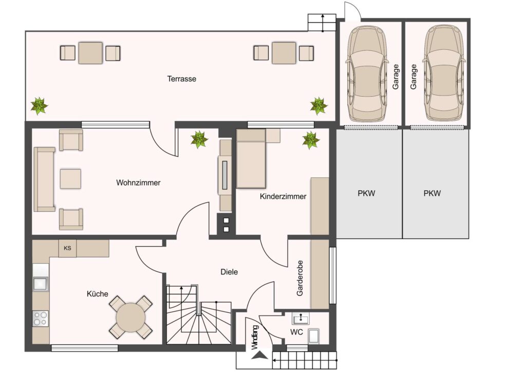* Garage mit Platz für mehr als zwei PKWs