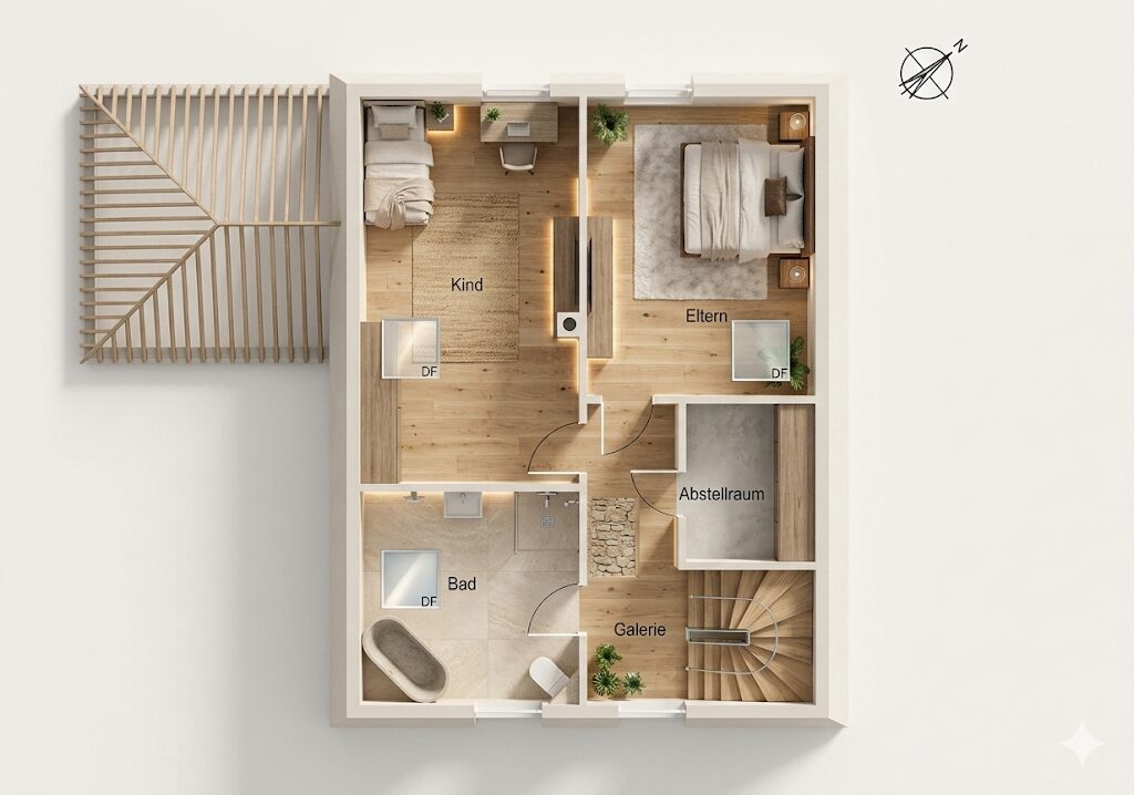 Das Erdgeschoss empfängt Sie mit einem offenen Wohn- und Essbereich samt angrenzender Küche. Im Dachgeschoss befinden sich die privaten Schlafräume sowie das luxuriöse Hauptbad. Das 417 m² große Grundstück bietet mit Carport und zwei Stellplätzen ausreichend Platz für Ihren Fuhrpark.