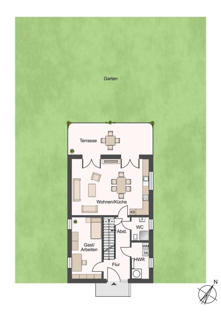 Beim Betreten des Hauses empfängt Sie ein zentraler Flur, von dem aus alle Räume im Erdgeschoss erreichbar sind. Auf der linken Seite befindet sich ein lichtdurchflutetes Zimmer, das sich ideal als Arbeits-, Gäste- oder Hobbyzimmer eignet. Rechtsseitig liegt der Hauswirtschaftsraum mit Anschluss für Waschmaschine und Trockner sowie der Haustechnik. Direkt daneben befindet sich ein modernes Tageslicht-Gästebad mit Dusche.