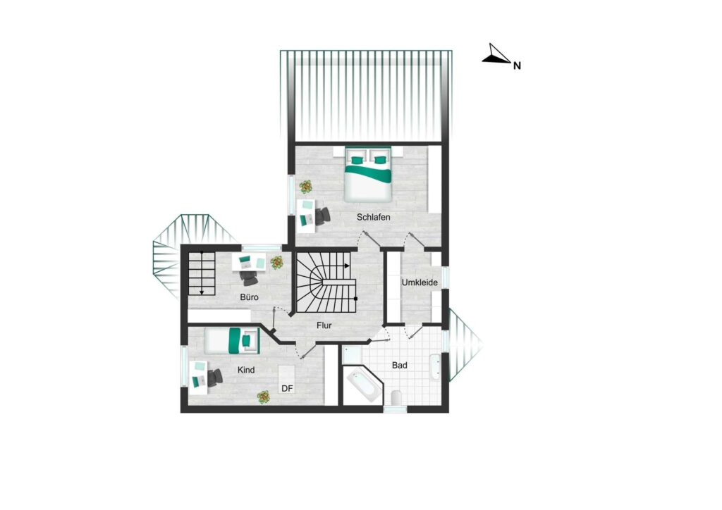 Bereits der einladende Eingangsbereich schafft eine freundliche Atmosphäre. Linker Hand befindet sich eine Garderobe mit ausreichend Platz, angrenzend ein praktisches Gäste-Bad. Eine elegante Glasschiebetür trennt die Diele vom großzügigen, offenen Wohn- und Essbereich. Das Wohnzimmer ist hell, geräumig und verfügt über einen charmanten Erkerbereich. Die moderne, offene Küche fügt sich harmonisch ein und bietet, ebenso wie der Wohnbereich, Zugang zur sonnigen Süd-Terrasse. Jalousien sorgen für eine angenehme Verschattung des Hauses. Das Highlight des Hauses ist die massive, maßangefertigte Holztreppe, die das Zentrum des Hauses bildet und ins Obergeschoss führt.