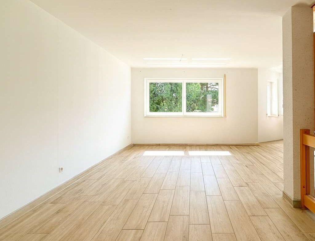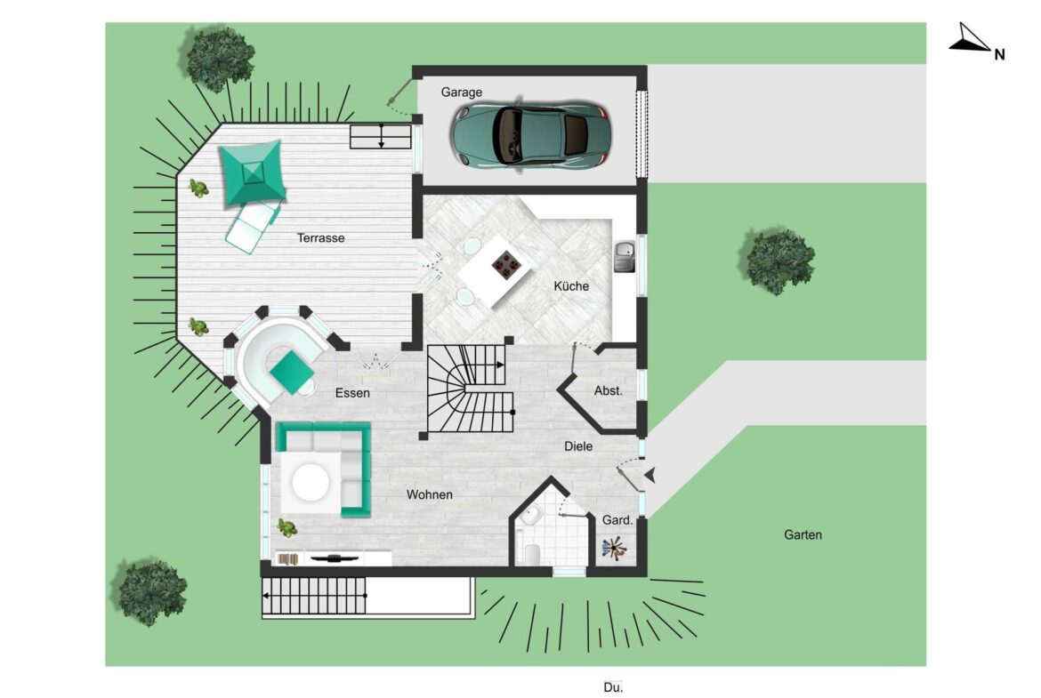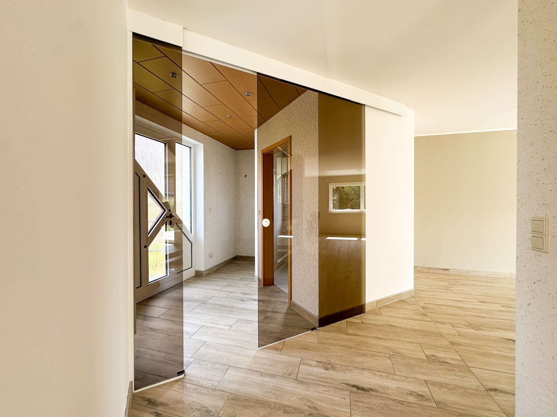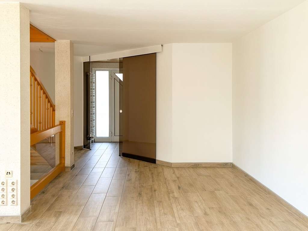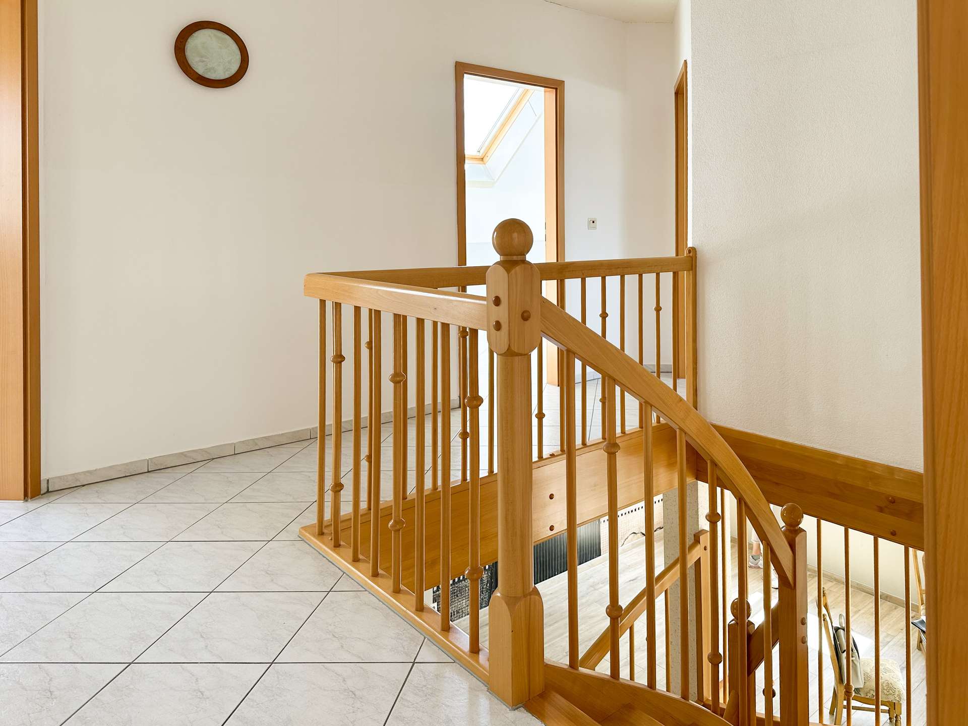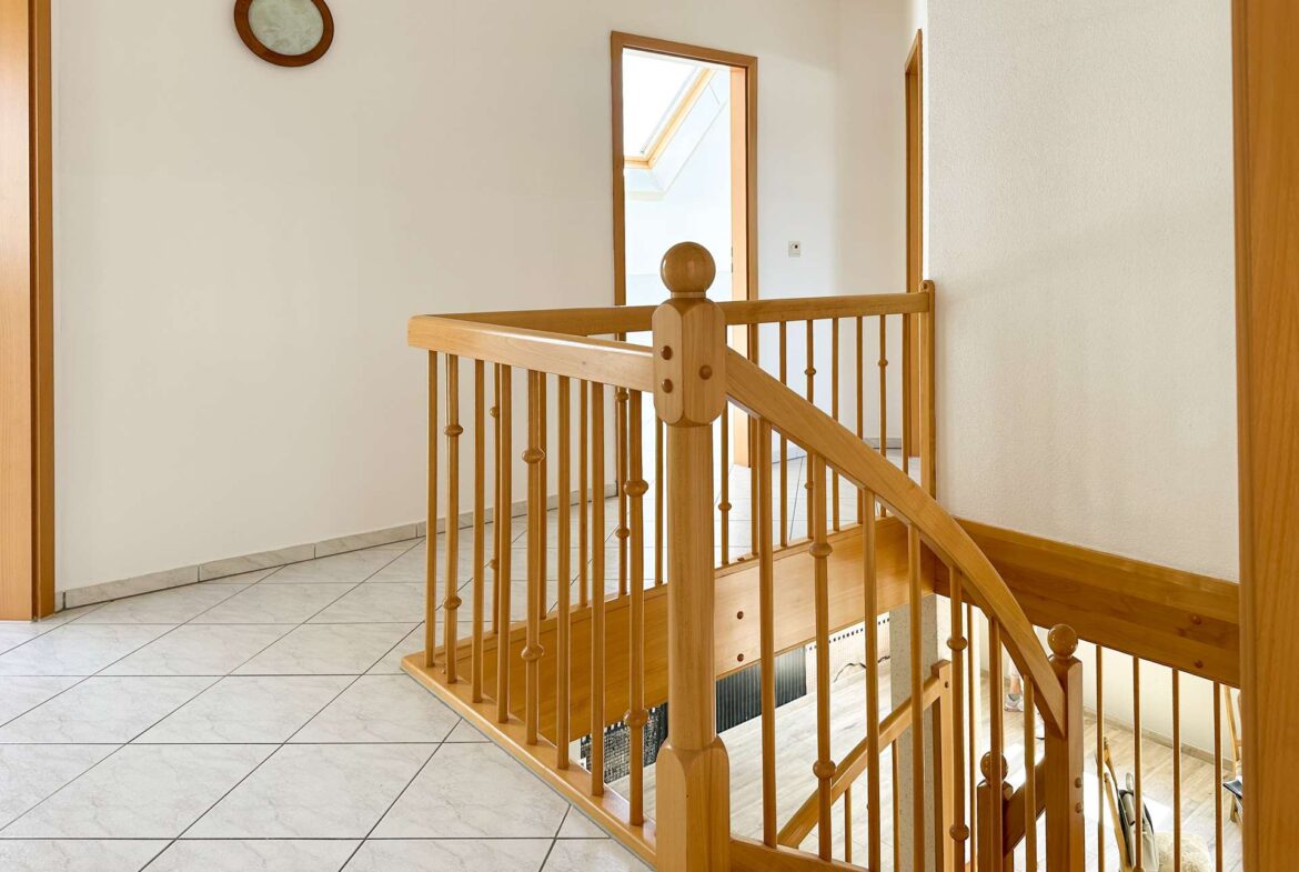 Bereits der einladende Eingangsbereich schafft eine freundliche Atmosphäre. Linker Hand befindet sich eine Garderobe mit ausreichend Platz, angrenzend ein praktisches Gäste-Bad. Eine elegante Glasschiebetür trennt die Diele vom großzügigen, offenen Wohn- und Essbereich. Das Wohnzimmer ist hell, geräumig und verfügt über einen charmanten Erkerbereich. Die moderne, offene Küche fügt sich harmonisch ein und bietet, ebenso wie der Wohnbereich, Zugang zur sonnigen Süd-Terrasse. Jalousien sorgen für eine angenehme Verschattung des Hauses. Das Highlight des Hauses ist die massive, maßangefertigte Holztreppe, die das Zentrum des Hauses bildet und ins Obergeschoss führt.