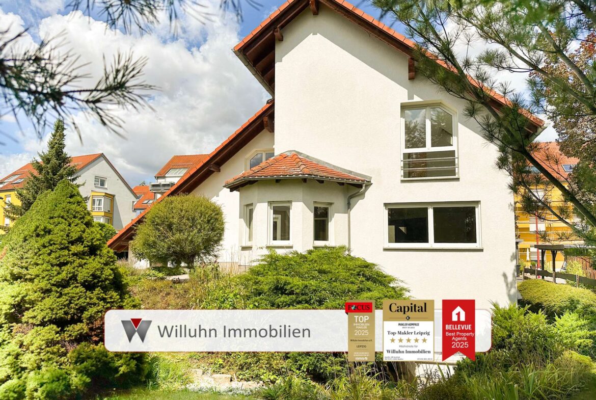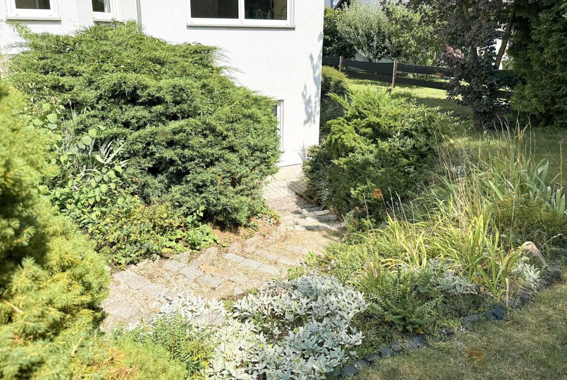 Zum Haus gehört eine angrenzende Garage mit elektrischem Rolltor sowie eine weitere, freistehende Garage auf dem Grundstück. Zusätzlich stehen drei weitere Außenstellplätze zur Verfügung. Der liebevoll angelegte Außenbereich mit Süd-Terrasse lädt zum Entspannen und Genießen ein.