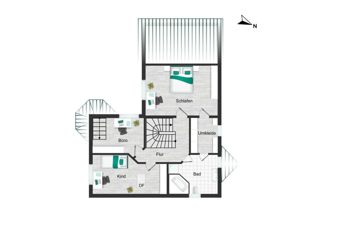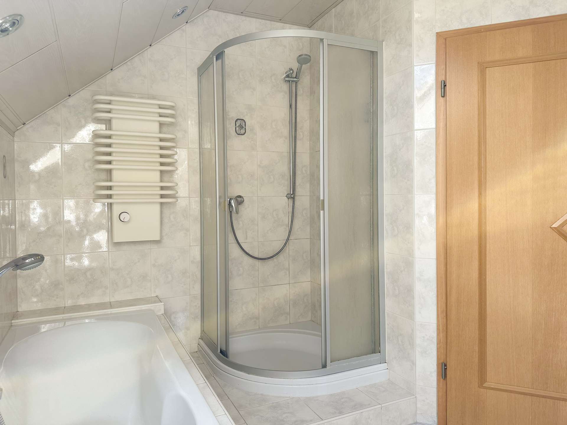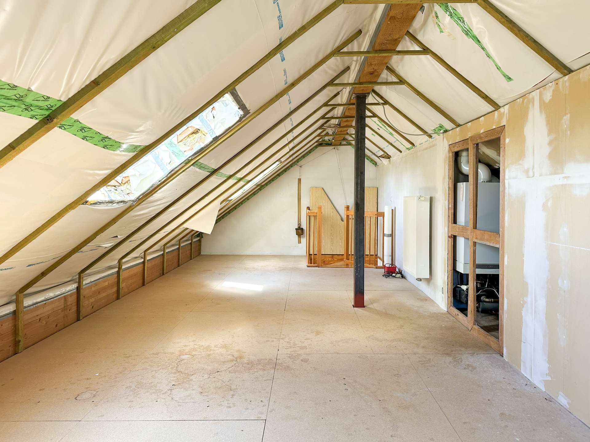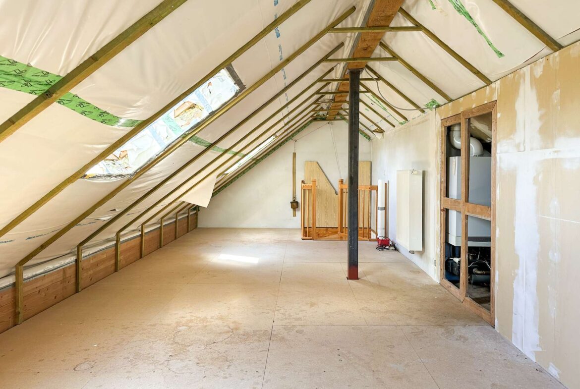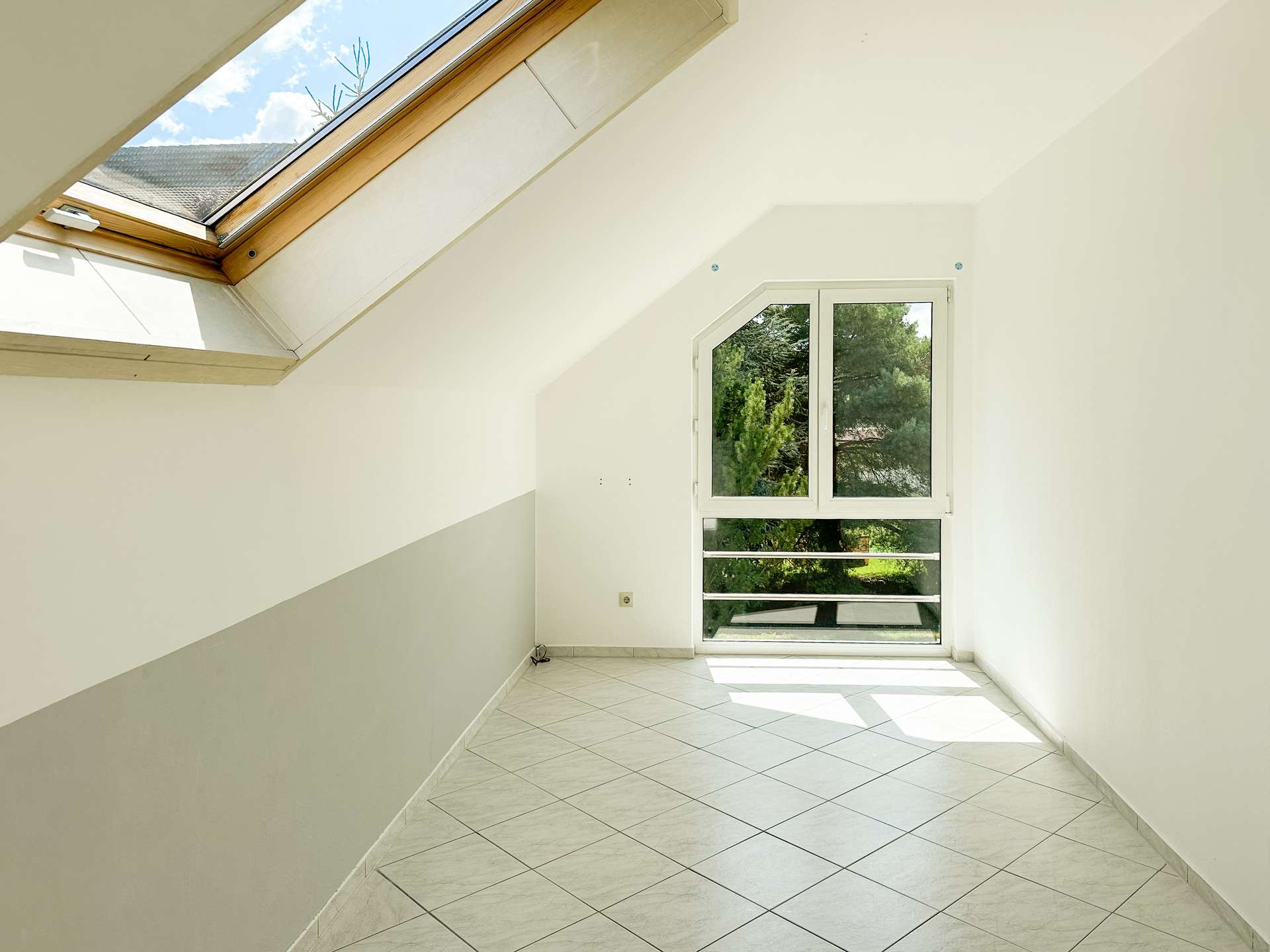 Hier erwarten Sie drei Zimmer, darunter ein großzügiges Schlafzimmer mit begehbarem Kleiderschrank und direktem Zugang zum Hauptbadezimmer. Dieses ist ausgestattet mit Badewanne und Dusche. Das Haus verfügt in jedem Raum über eine individuell einstellbare Fußbodenheizung. Ein Zimmer ist mit einer Treppe zum gedämmten Dachgeschoss verbunden, das zusätzliches Ausbaupotenzial bietet.
