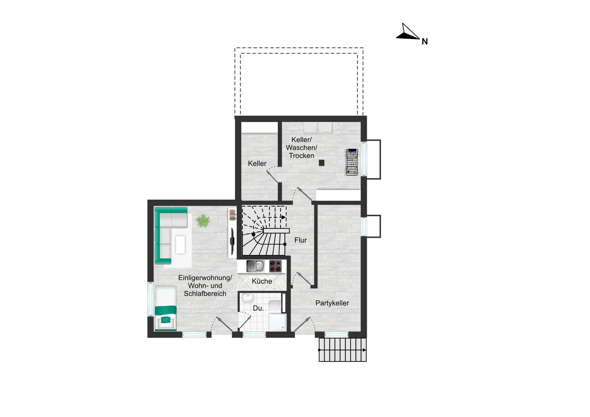 Der Kellerbereich beeindruckt mit einem Partykeller, einem Technikraum mit Waschmaschinenanschluss sowie einem separaten Zimmer, in dem ein Saunabereich eingerichtet werden kann. Darüber hinaus gibt es eine charmante Einliegerwohnung mit Tageslichtbad und Dusche, ideal für Gäste oder zur Vermietung.