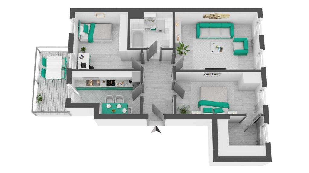 Die Wohnung verfügt über zwei komfortable Schlafzimmer, die vielseitige Nutzungsmöglichkeiten eröffnen. Besonders hervorzuheben ist der praktische Ankleidebereich, der direkt an das Elternschlafzimmer anschließt. Mittelpunkt der Wohnung ist das lichtdurchflutete Wohnzimmer, das sowohl für erholsame Stunden als auch für gesellige Abende bestens geeignet ist.