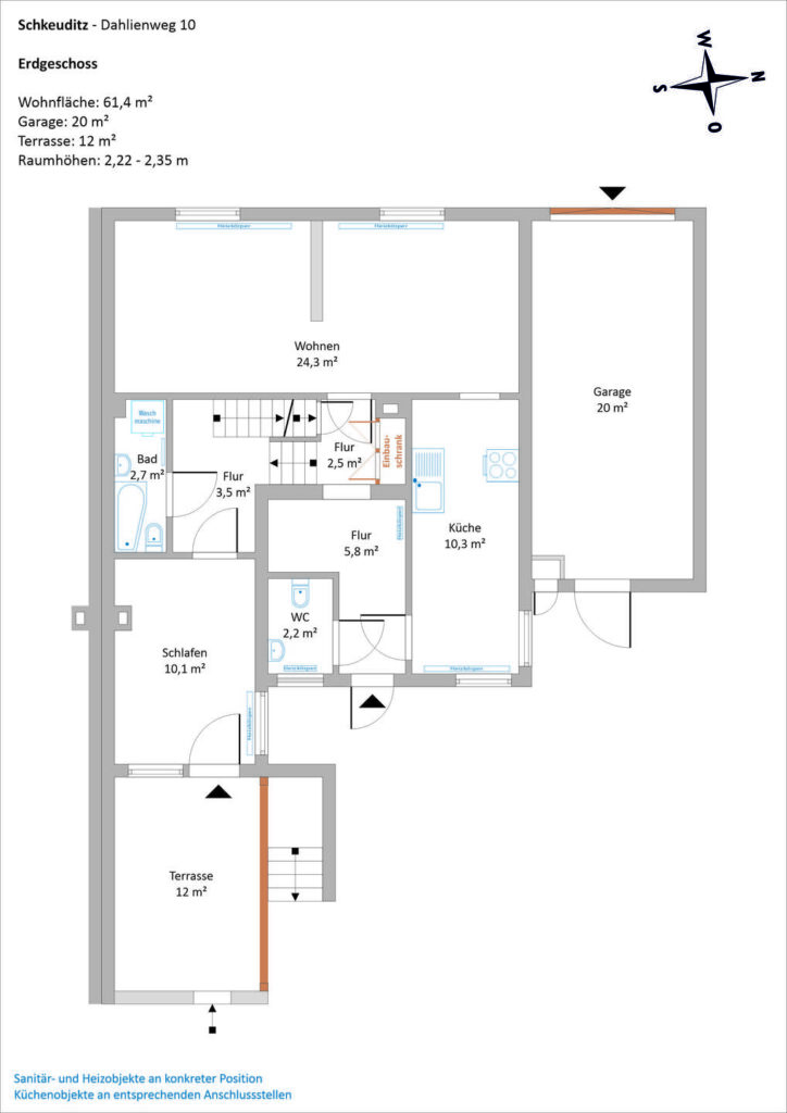 Das 1½-geschossige Gebäude ist im Erdgeschoss teilweise im Split-Level angelegt und verfügt über 4 Zimmer, ein Wannenbad, ein Gäste-WC sowie eine großzügige Küche, die direkt vom lichtreichen Wohnbereich aus zugänglich ist.