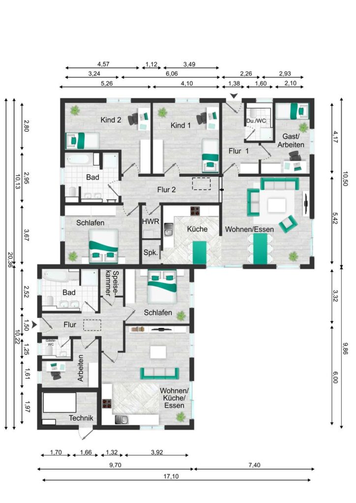 Das Haupthaus empfängt Sie mit einem lichtdurchfluteten Wohn- und Essbereich samt moderner Einbauküche, vier Schlafzimmern, einem eleganten Tageslichtbad mit Wanne, Dusche und Doppelwaschbecken sowie einem zusätzlichen Gäste-WC mit Dusche. Ein Abstellraum mit Waschmaschinenanschluss sowie ein Dachspitz als Stauraum runden den Komfort ab.