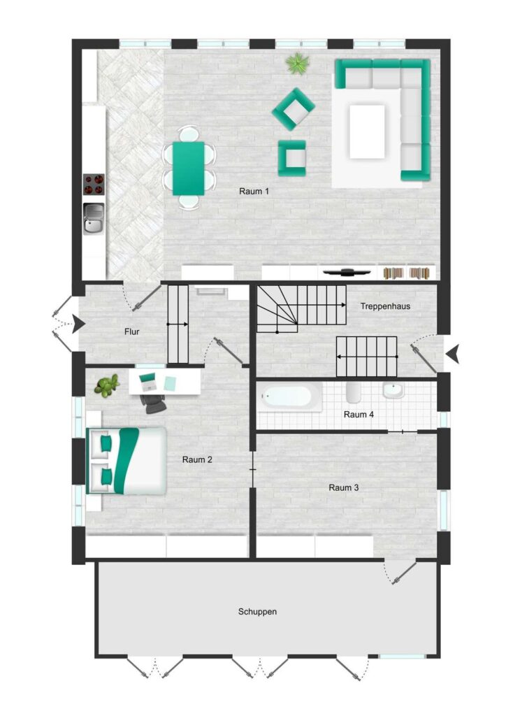 Ein L-förmiger, großzügiger Komplex mit zwei Vollgeschossen, Dachboden und Unterkellerung – verbunden mit der Alten Schule. Perfekt für eine gemischte Nutzung: von Wohneinheiten über Büros, Werkstätten bis hin zu gemeinschaftlichen Räumen. Der rechte Flügel – das ehemalige Lehrerhaus – eignet sich besonders gut für den Umbau in zwei stilvolle Wohnungen oder ein großzügiges Einfamilienhaus.