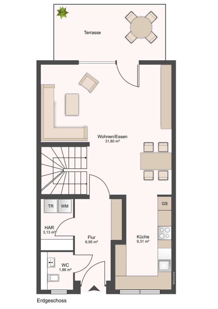 Beim Betreten des Hauses gelangen Sie in einen einladenden Eingangsbereich mit ausreichend Platz für eine Garderobe. Gleich daneben befinden sich der Hausanschlussraum sowie das Gäste-WC mit Fenster.