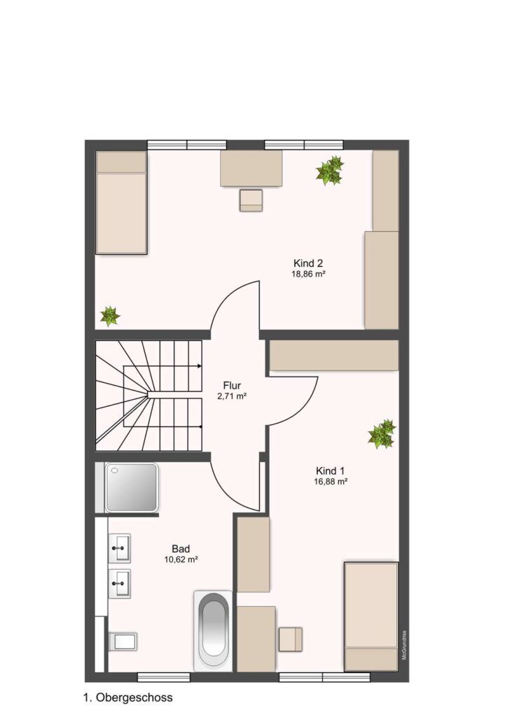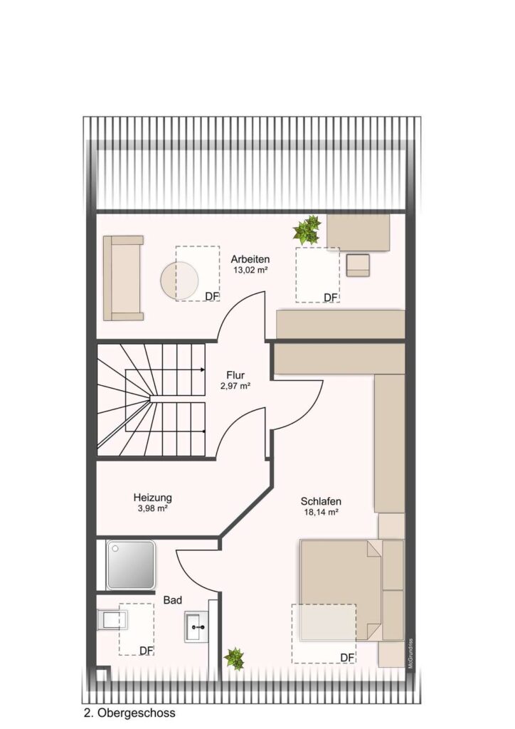Über die stilvolle Wendeltreppe erreichen Sie die beiden Obergeschosse. Diese bieten mit insgesamt vier Schlafräumen und zwei modernen Tageslichtbädern reichlich Platz für individuelle Wohnwünsche und Rückzugsorte für jedes Familienmitglied.