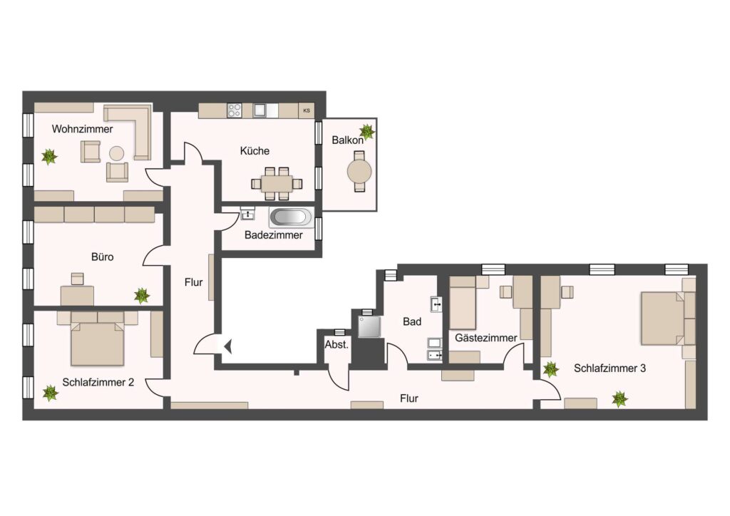 Besonders beeindruckend sind die außergewöhnlich großen Zimmer, die der Wohnung ein offenes, einladendes Flair verleihen. Die gut geschnittene Küche bietet ausreichend Platz für gemeinsame Kochabende mit der ganzen Familie und verfügt über einen direkten Zugang zum Balkon mit Blick auf den MDR-Turm.