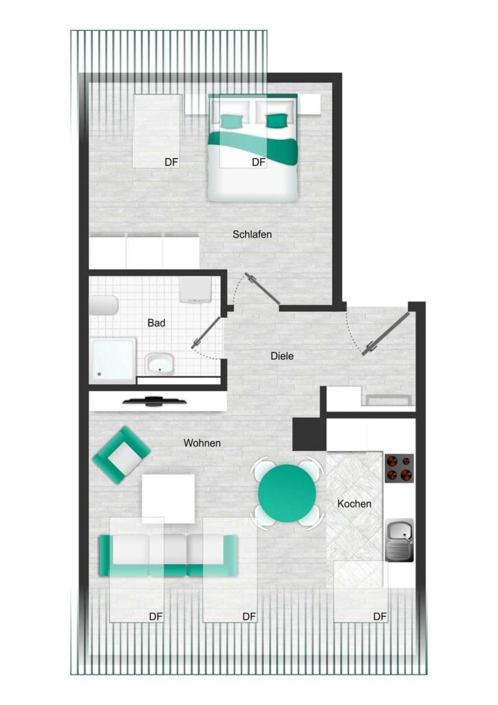 Das großzügige Wohnzimmer empfängt Sie mit viel Tageslicht und bietet ausreichend Platz für individuelle Wohnideen. Die offene Küche fügt sich harmonisch an und schafft einen kommunikativen Wohnbereich. Das gemütliche Schlafzimmer bietet genügend Raum für eine entspannte Rückzugsoase und lässt sich flexibel einrichten. Im Badezimmer erwartet Sie eine moderne Dusche sowie der Platz für die Waschmaschine.