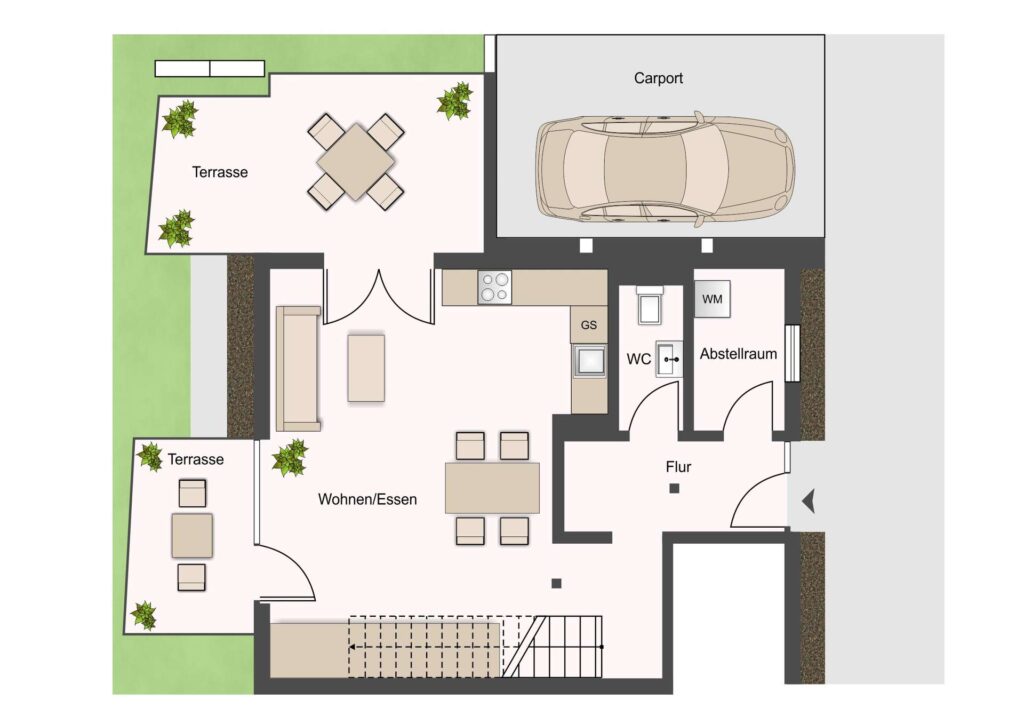 Der freundliche Eingangsbereich empfängt Sie und führt in den offenen Wohn- und Essbereich mit integrierter Küche — das Herzstück des Hauses. Von hier aus gelangen Sie direkt auf die Terrassen sowie in den eigenen Gartenanteil und genießen einen schönen Blick ins Grüne.