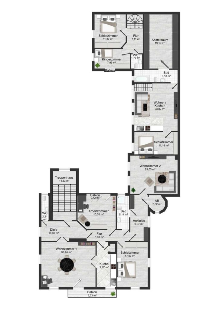 6 Wohnungen befinden sich im Objekt. 4 im Haupthaus, eine im Seitengebäude und eine im Hinterhaus/Gartenhaus, das über einen eigenen Mietergarten verfügt.