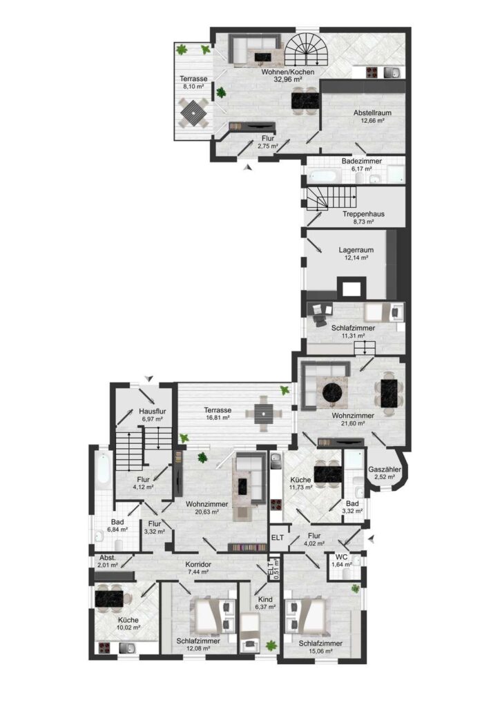 6 Wohnungen befinden sich im Objekt. 4 im Haupthaus, eine im Seitengebäude und eine im Hinterhaus/Gartenhaus, das über einen eigenen Mietergarten verfügt.