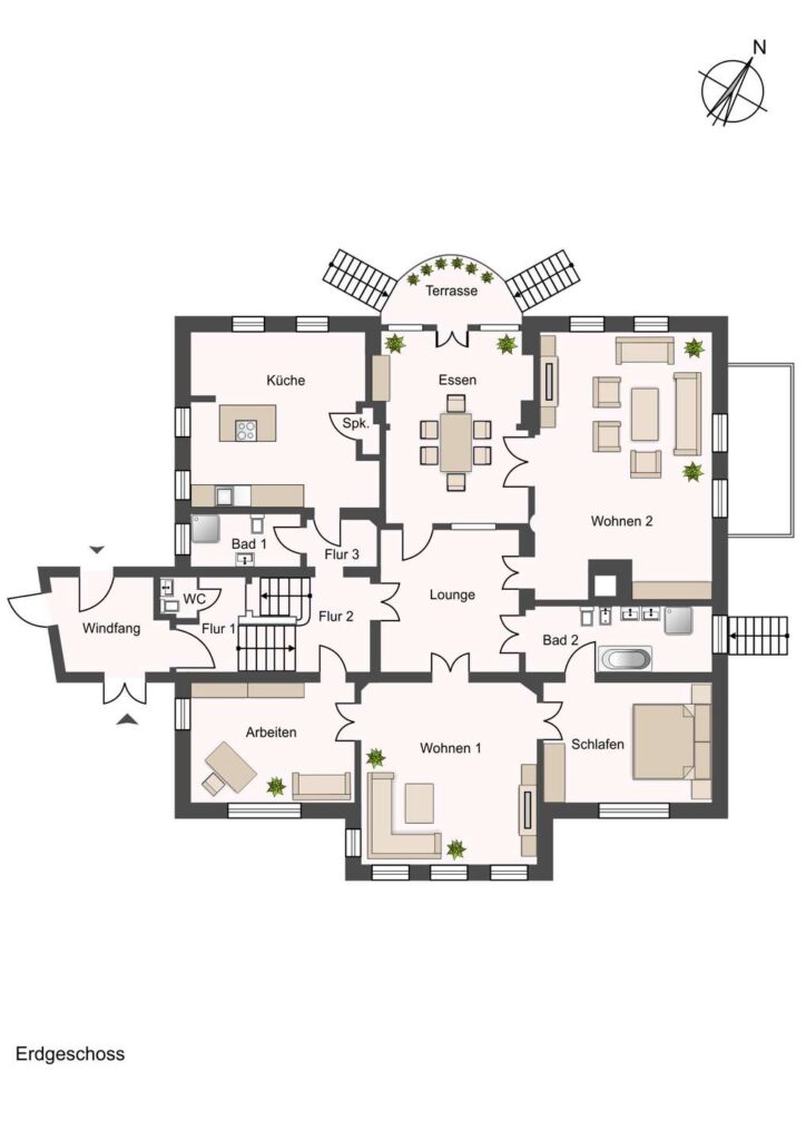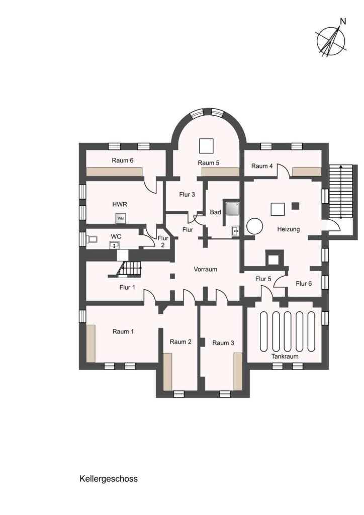 Die vorhandene Grundrissgestaltung mit weitläufigen, lichtdurchfluteten Räumen, repräsentativen Deckenhöhen und separaten Erschließungsbereichen schafft eine hervorragende Basis für eine Umnutzung in mehrere Wohneinheiten oder eine konzeptionelle Neuordnung für betreutes Wohnen bzw. Pflege.