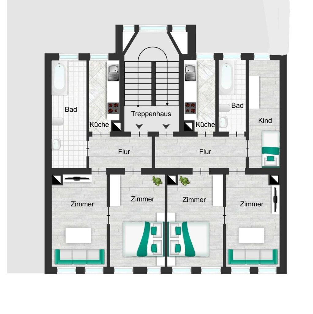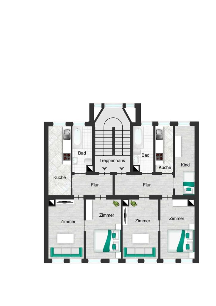 Die Gesamtwohnfläche von ca. 405 m² verteilt sich auf 7 Wohneinheiten, die jeweils als 2- bis 3-Zimmer-Wohnungen angelegt sind. Pro Etage befinden sich zwei Einheiten, was eine ausgewogene Mieterstruktur ermöglicht und das Haus zu einer stabilen Kapitalanlage macht.