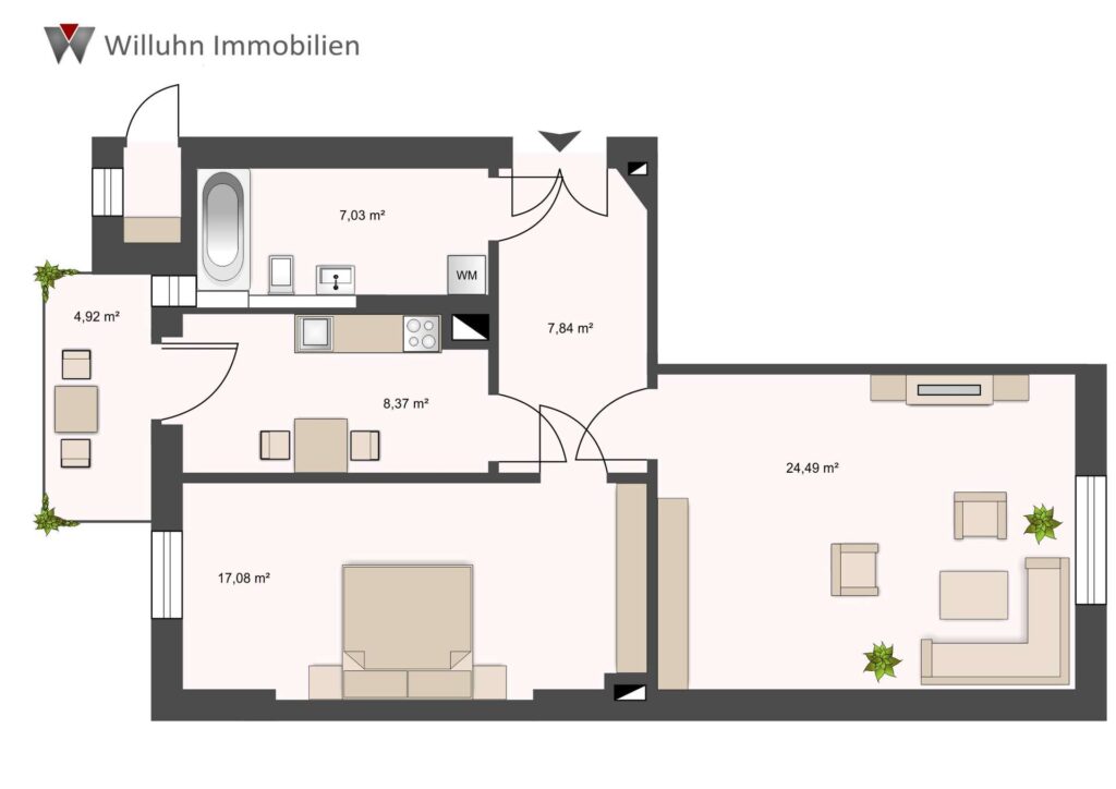 Über den geräumigen Flur sind alle Räume separat erreichbar. Das Wohnzimmer verfügt über knapp 25 Quadratmeter Wohnfläche, während der zweite Raum über etwa 17 Quadratmeter verfügt und sich ideal als Schlafzimmer eignet. Damit ist die Wohnung sowohl für Singles und Paare als auch für eine Wohngemeinschaft bestens geeignet.