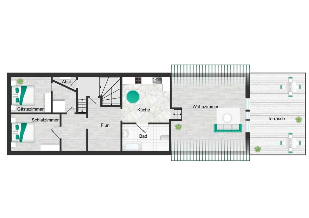 Über eine geräumige Innentreppe mit stilvollen Lichtelementen gelangen Sie nach oben in den Schlaf- und Ruhebereich, der ebenfalls großzügig gestaltet ist und individuell genutzt werden kann.