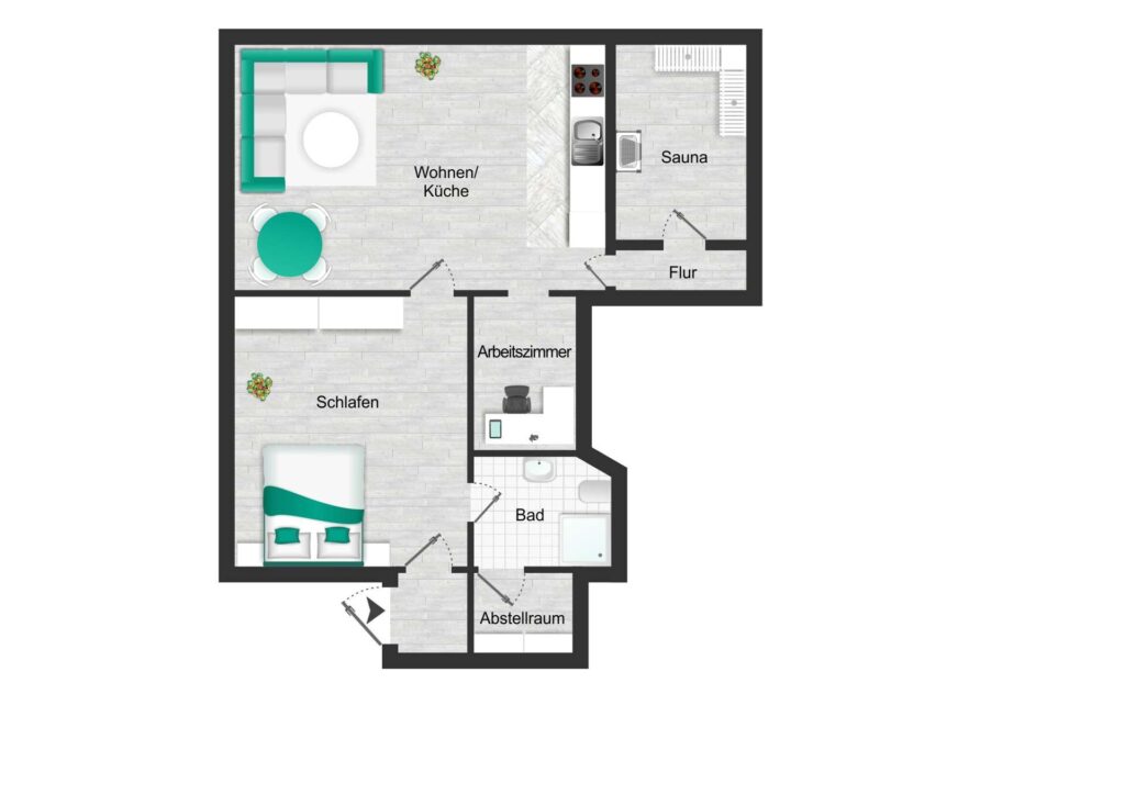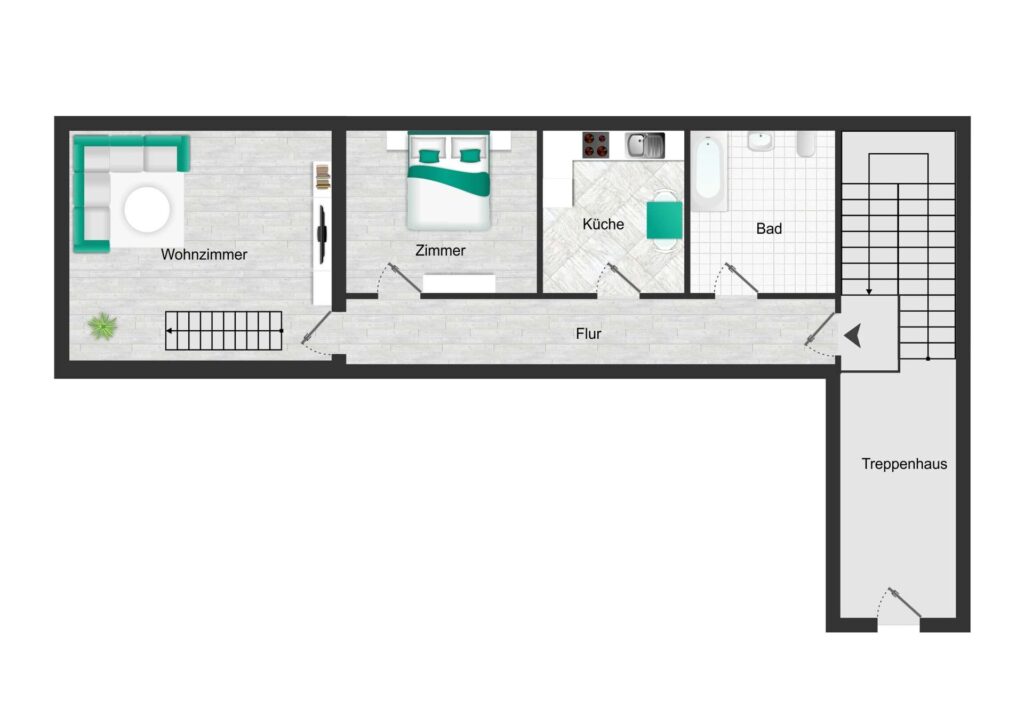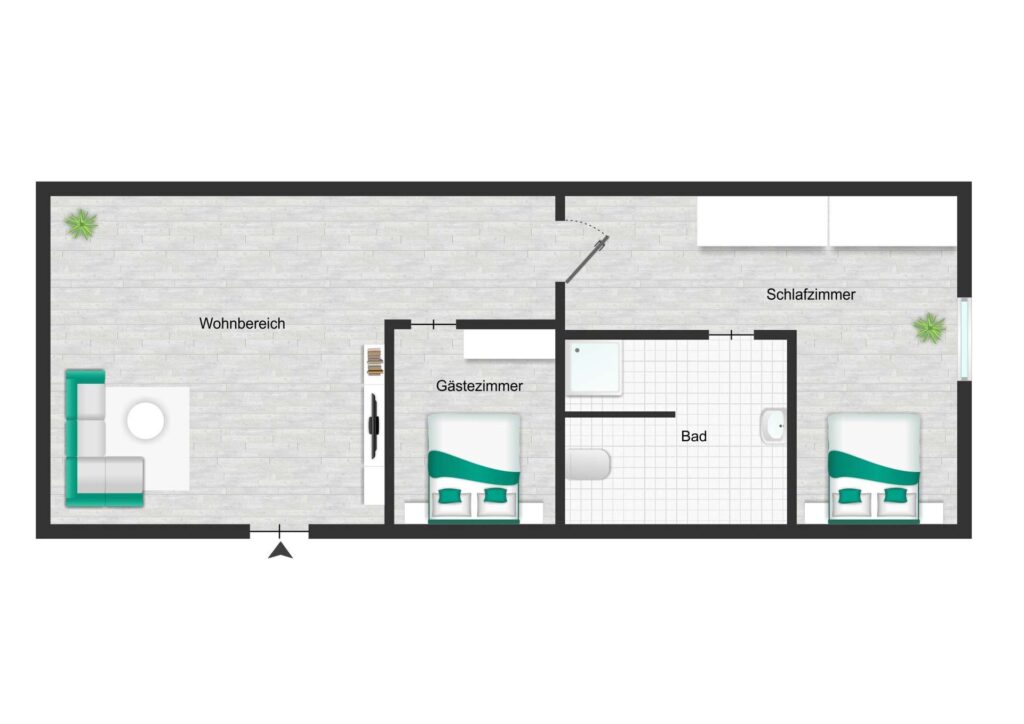 – WE04 im EG – ca. 50 m²: 1 Zimmer, Küche, Bad, aktuell als Ferien- und Gästewohnung genutzt