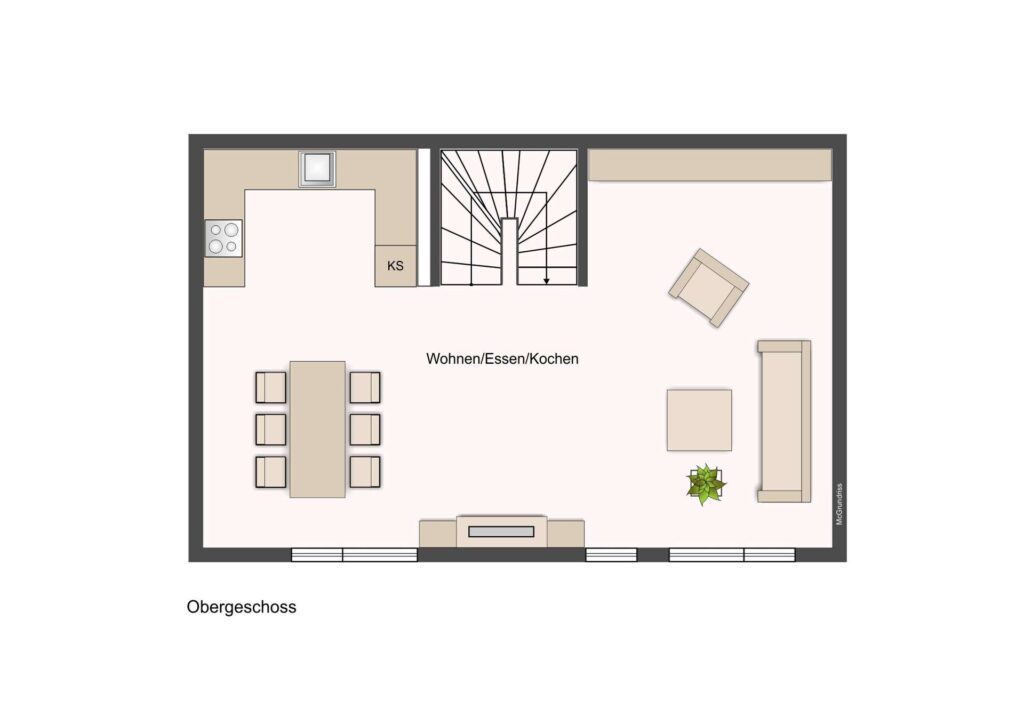 Über eine massive Holztreppe gelangen Sie ins Obergeschoss, wo sich das Herzstück des Hauses befindet: der lichtdurchflutete Wohn- und Essbereich mit offener Küche. Dieser großzügige Raum bietet ideale Bedingungen für gesellige Abende und gemütliche Familientreffen. Die moderne Fußbodenheizung und der Echtholzparkettboden schaffen ein behagliches Wohnambiente.