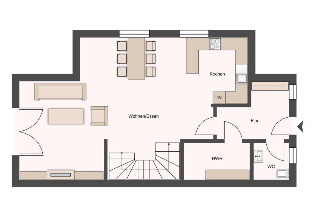 Schon beim Eintreten wird der hochwertige Charakter der Immobilie spürbar. Der einladende Eingangsbereich bietet ausreichend Raum für eine Garderobe und erschließt das Gäste-WC sowie den praktischen Hauswirtschaftsraum, in dem Haustechnik und Waschmaschine ordentlich untergebracht sind.