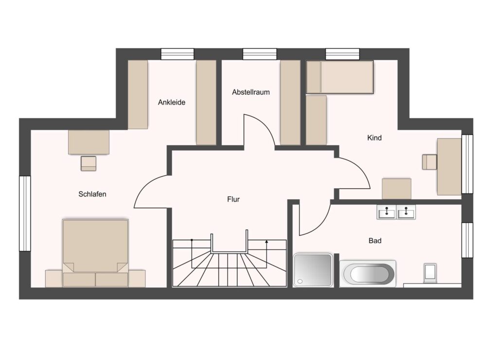 Im Obergeschoss erwartet Sie ein durchdachtes Raumkonzept: Ein zentraler Flur verbindet alle Räume dieser Ebene. Das großzügige Schlafzimmer mit angrenzender Ankleide schafft eine private Rückzugsoase. Ein weiteres Zimmer eignet sich ideal als Kinder-, Gäste- oder Arbeitszimmer. Das moderne Tageslichtbad überzeugt mit einer hochwertigen Ausstattung und bietet sowohl eine Dusche als auch eine Badewanne. Ein zusätzlicher Abstellraum ergänzt das Platzangebot sinnvoll.