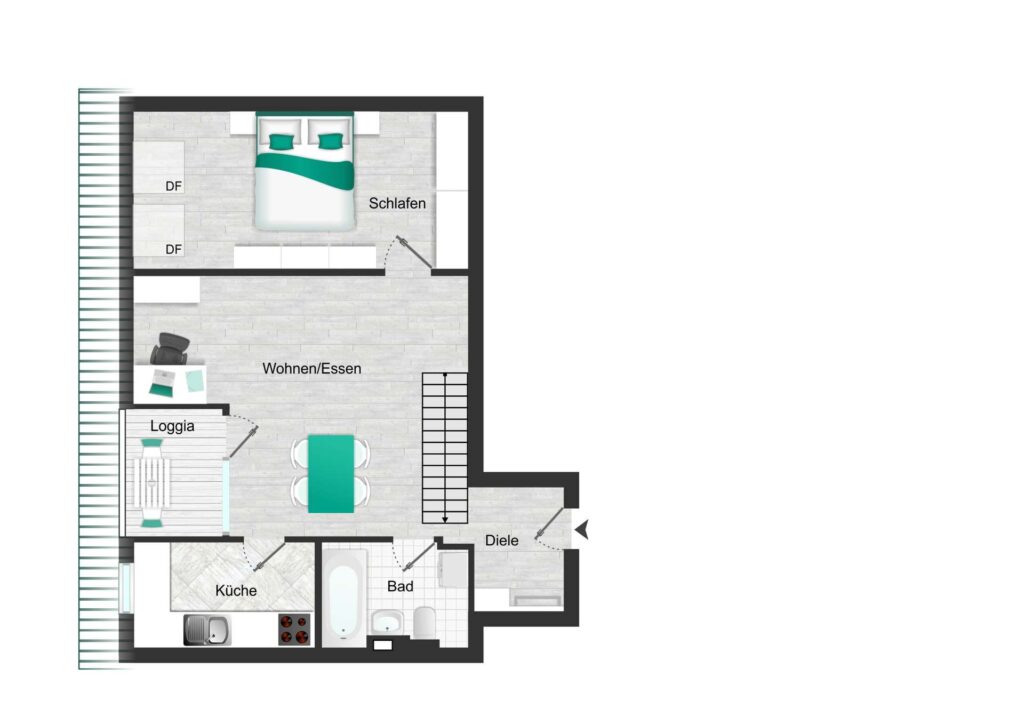 Die vermietete Maisonette-Wohnung befindet sich im 2. Obergeschoss eines gepflegten Mehrfamilienhauses (Baujahr 1997) und bietet ca. 71 m² Wohnfläche mit einem praktischen Grundriss auf zwei Ebenen. Der helle offene Essbereich mit Zugang zur hofseitigen Loggia, eine separate geräumige Küche, ein Badezimmer mit Wanne und Waschmaschinenanschluss, ein ruhiges Schlafzimmer sowie ein großzügiger Wohnbereich, auf der oberen Ebene, sorgen für eine attraktive Wohnqualität und gute