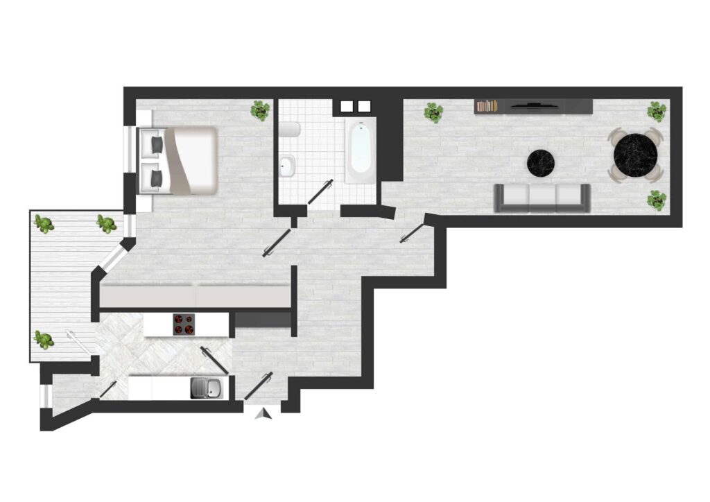 So ist das Wohnzimmer nach Süden ausgerichtet und erhält durch seine großzügige Fensterfront wohltuende Helligkeit. In der grünen Jahreszeit erfreuen hier die Bäume auch den Ausblick zur Coppistraße. Ähnliches überrascht beim Betreten des ebenso großen Schlafraums, wo die breite Fensterfront auch hier mit einem wundervollen Blick in den grünen Innenhof beeindruckt. Aufgrund des Zuschnitts des Schlafzimmers bieten sich hier gleichermaßen großzügige Einrichtungsflächen. So sind die beiden großen Wohnräume das Markenzeichen dieser Wohnung – und dies setzt sich auf dem Balkon fort, auf dem man an einer Kaffeetafel den Sommertag oder -abend genießen kann. Von der Küche aus, an die ein kleiner Abstellraum angrenzt, betritt man den Balkon.