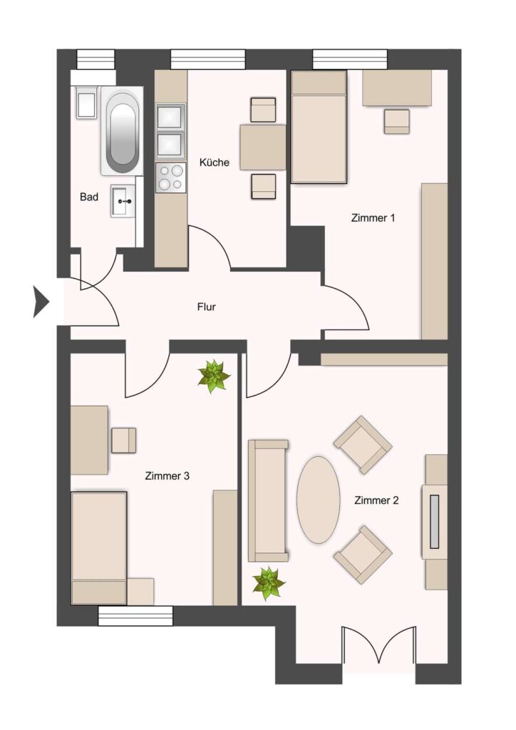 Zwei der Wohnräume orientieren sich zur Straßenseite, während der dritte Raum sowie die separate Küche den Blick in den begrünten Innenhof eröffnen, eine gelungene Kombination aus urbanem Umfeld und ruhiger Wohnatmosphäre.