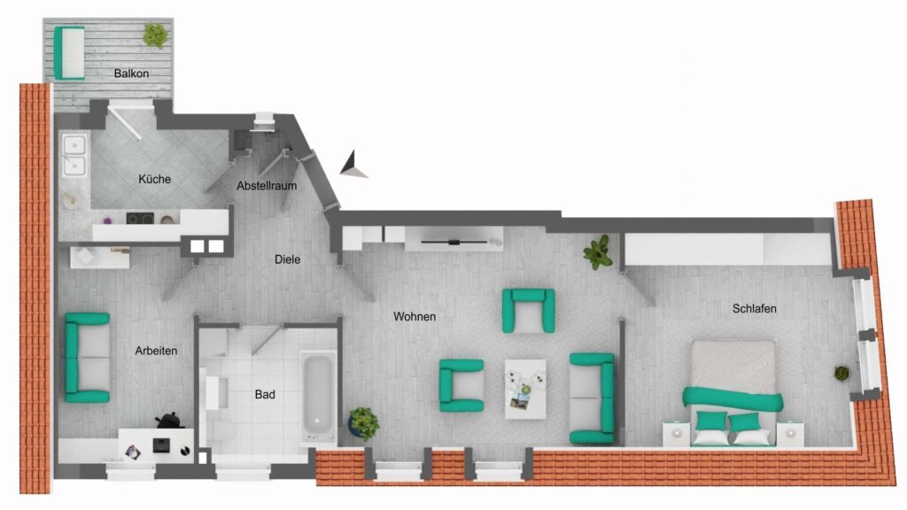 Im Mittelpunkt steht der großzügige Wohnbereich mit etwa 23 m², der durch große Fensterflächen ein lichtdurchflutetes Raumgefühl schafft. Angrenzend zum Wohnzimmer befindet sich das östlich ausgerichtete Schlafzimmer. Ein weiteres Zimmer bietet vielfältige Nutzungsmöglichkeiten, ob als Schlafzimmer, Arbeitszimmer oder Gästezimmer. Die kompakt geschnittene Küche grenzt direkt an den West-Balkon, der vor allem in den Nachmittags- und Abendstunden zum Verweilen im Freien einlädt.