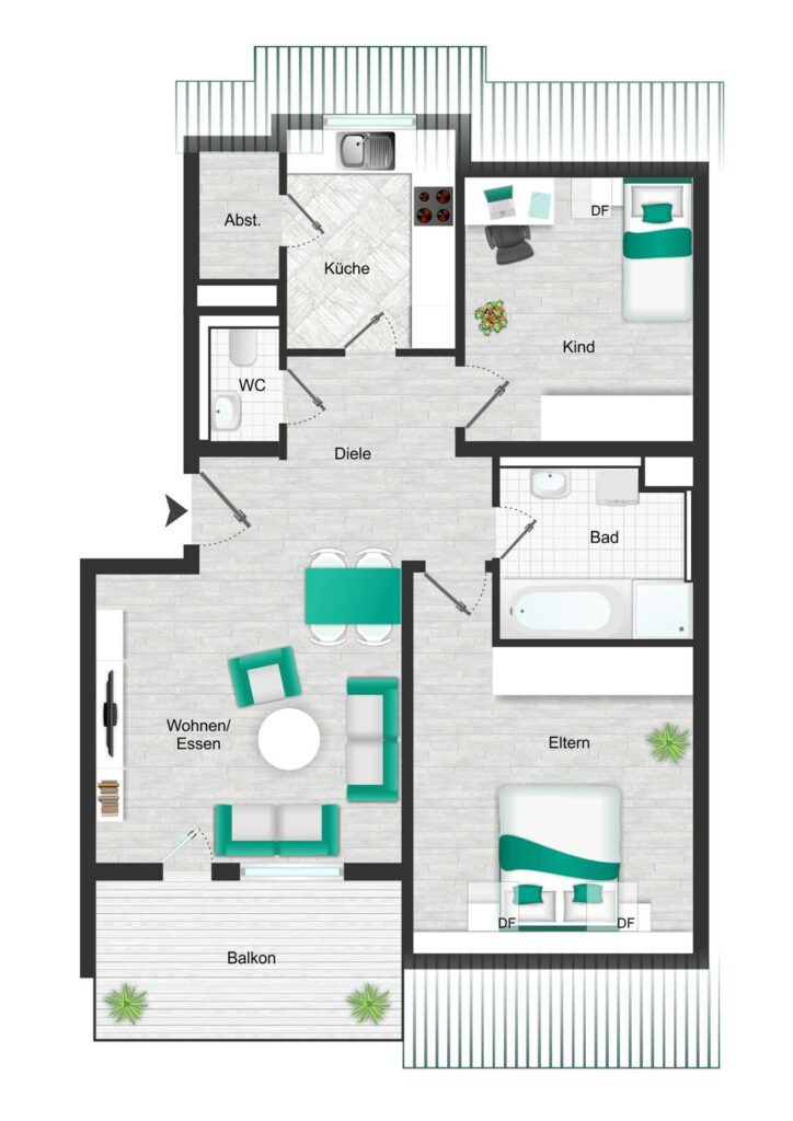 Schon beim Betreten der Wohnung wird deutlich, wie sinnvoll und großzügig der Schnitt gewählt ist. Vom zentralen Flur aus gelangt man bequem in jedes Zimmer, die Küche und das Bad. Das offene Wohnzimmer schafft durch seine zum Flur hin geöffnete Gestaltung ein besonders weitläufiges Wohngefühl. Gemeinsam mit dem sonnigen, großzügigen Balkon bildet es den Mittelpunkt des täglichen Lebens – ein Ort, der zum Entspannen, Genießen und Durchatmen einlädt.