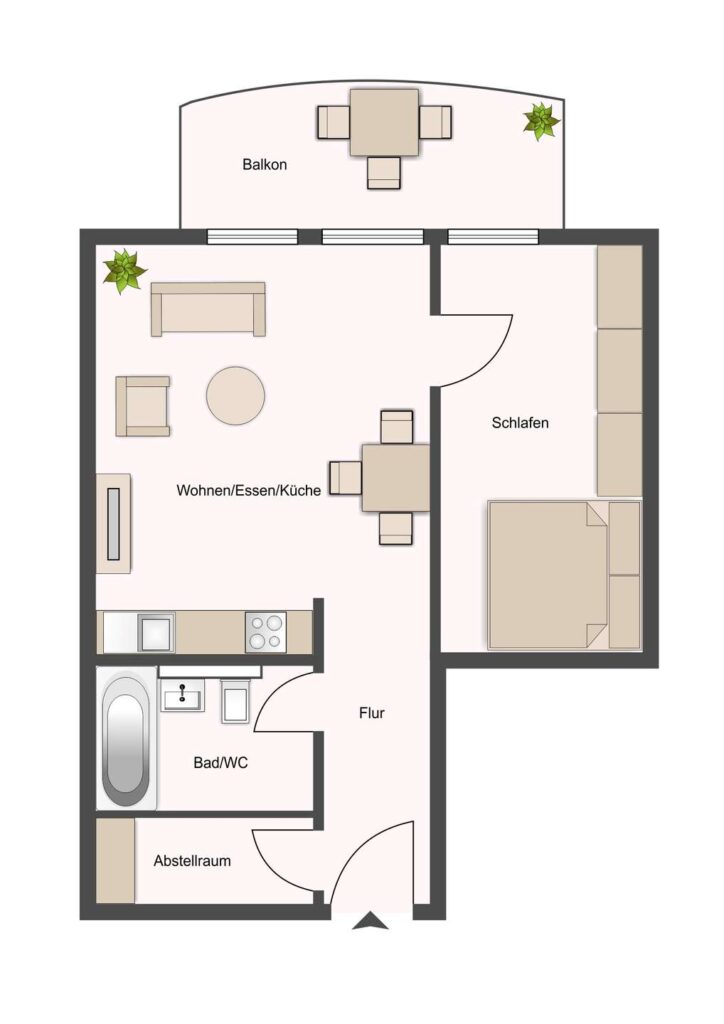 Direkt beim Eintritt in die Wohnung erreicht man den Flur. Vom Flur ist das Wannenbad, die Abstellkammer sowie Wohn- und Schlafzimmer zu begehen. Eine bodentiefe Fensterfront erhellt den Wohn- und Schlafbereich über die gesamte Breite der Räume mit schönstem Tageslicht. Der herrliche und geräumige Balkon erstreckt sich ebenfalls über die gesamte Breite der Wohnung und ist sowohl vom Wohn- und Schlafzimmer begehbar. Hier sitzt man gern und lässt den Blick über die gepflegte Anlage sowie den grünen und ruhigen parkähnlichen Hinterhof schweifen.