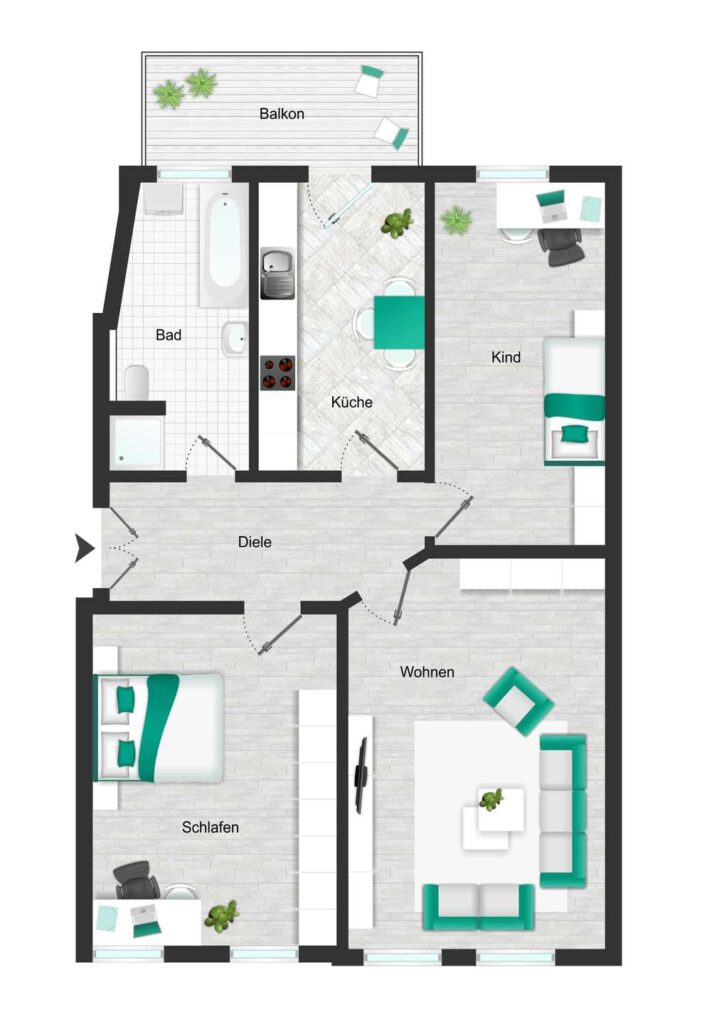 Das helle Wohnzimmer bietet viel Platz zur individuellen Gestaltung. – ein idealer Ort zum Entspannen mit Blick in den begrünten Innenhof. Das Schlaf- und Kinderzimmer bestechen durch angenehme Größen und bieten Rückzugsmöglichkeiten zum Wohlfühlen. Die separate Küche gewährt direkten Zugang zum großzügigen Balkon.
