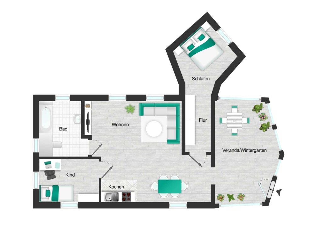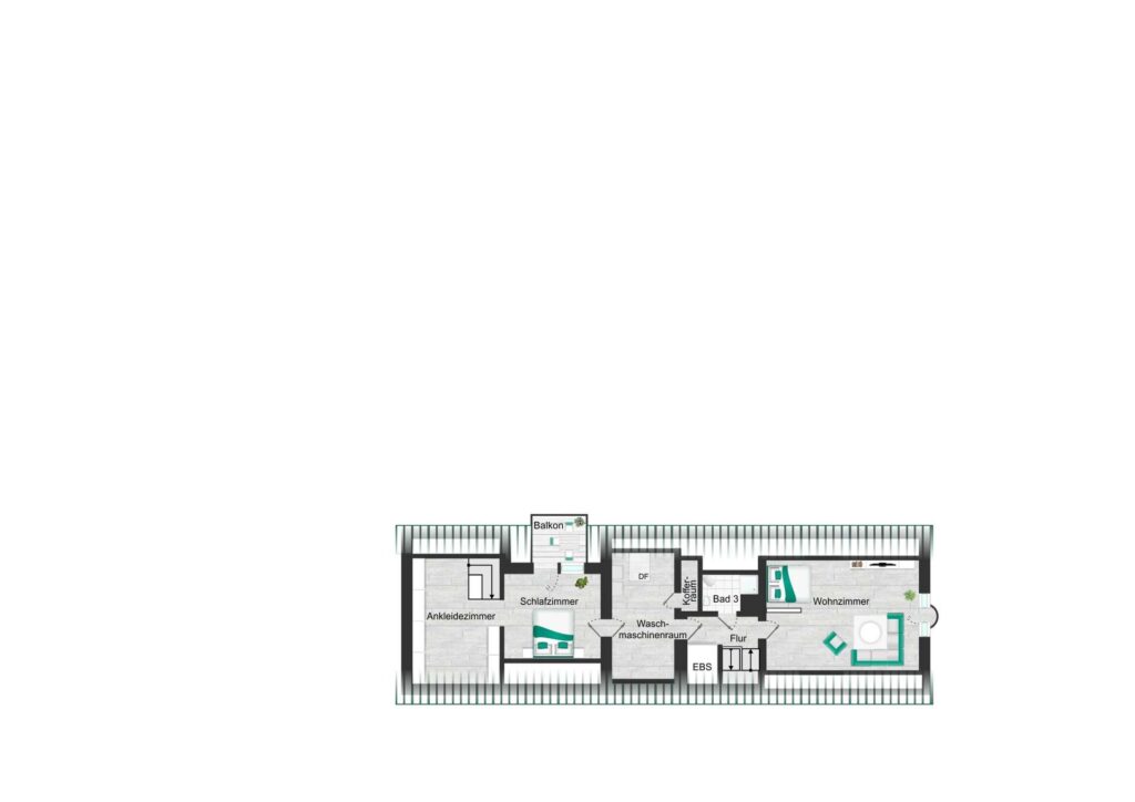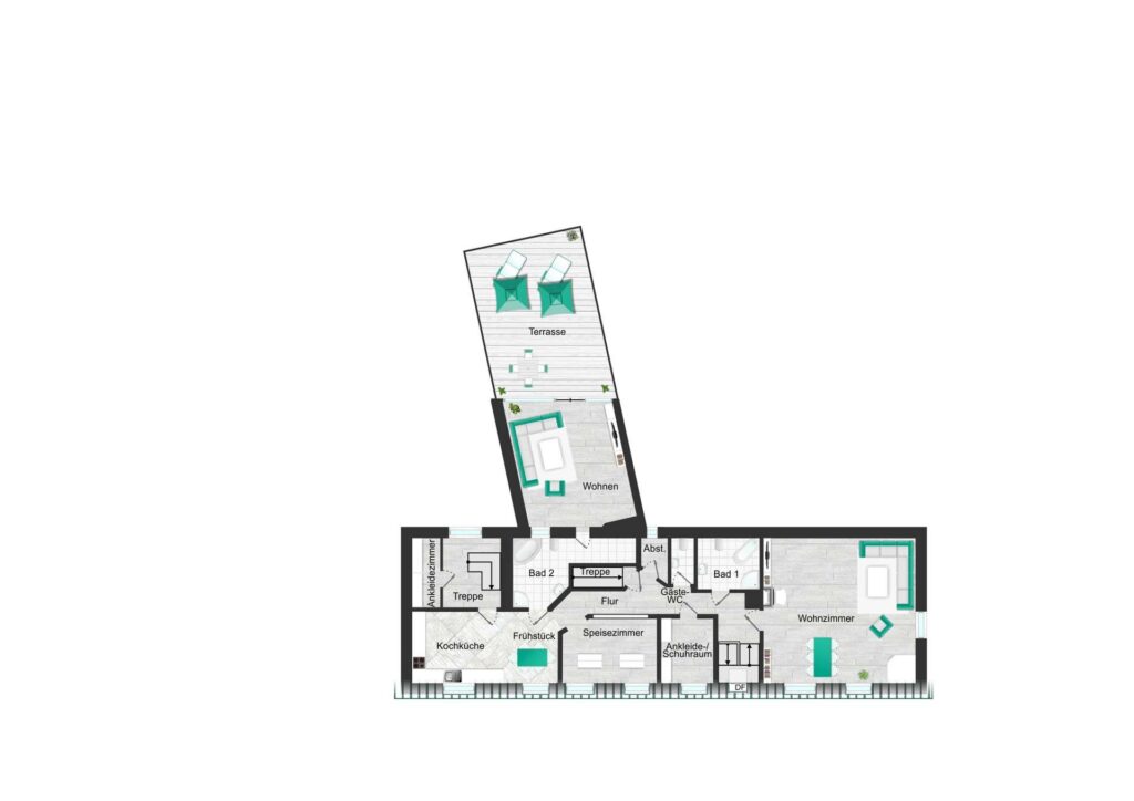 Auch der Eigenbedarf kann hier realisiert werden – im Obergeschoss des Haupthauses befindet sich eine Maisonette Wohnung mit ca. 272,67 m² Wohnfläche. Der Umbau in Ferien-Apartments wäre denkbar.