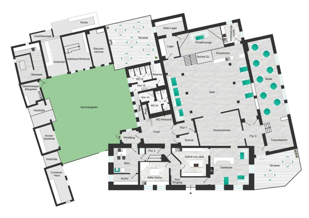 Der vielseitige Eventsaal eignet sich hervorragend für Hochzeiten, diverse Feiern, Catering-Services und Firmenanlässe – ein direkter Pluspunkt für ambitionierte Betreiber, die ein großes Spektrum an Zielgruppen bedienen möchten. Die Bebauung mit mehreren Ebenen, verbunden mit dem separaten Gästehaus und Gartenbereich, unterstreicht das Potenzial dieses Objekts als voll ausgestattete Erlebnisdestination.