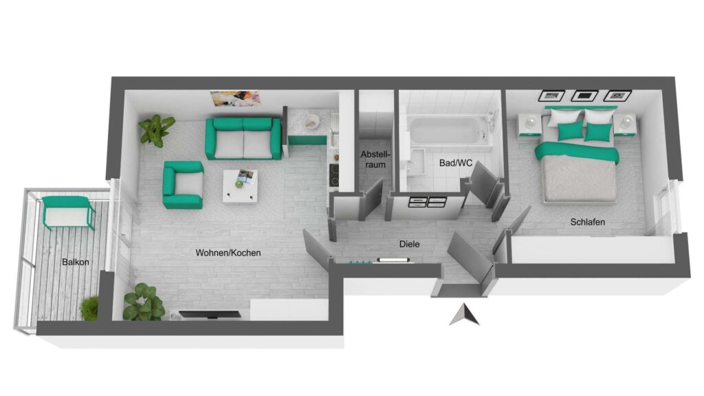 Das Herzstück der Wohnung ist das helle Wohnzimmer mit Zugang zum Balkon, der einen entspannten Blick in den ruhigen Innenhof bietet. Die angrenzende Einbauküche ist bereits vollständig ausgestattet. Das Schlafzimmer ist gut geschnitten und bietet ausreichend Platz für einen Kleiderschrank und ein Doppelbett.