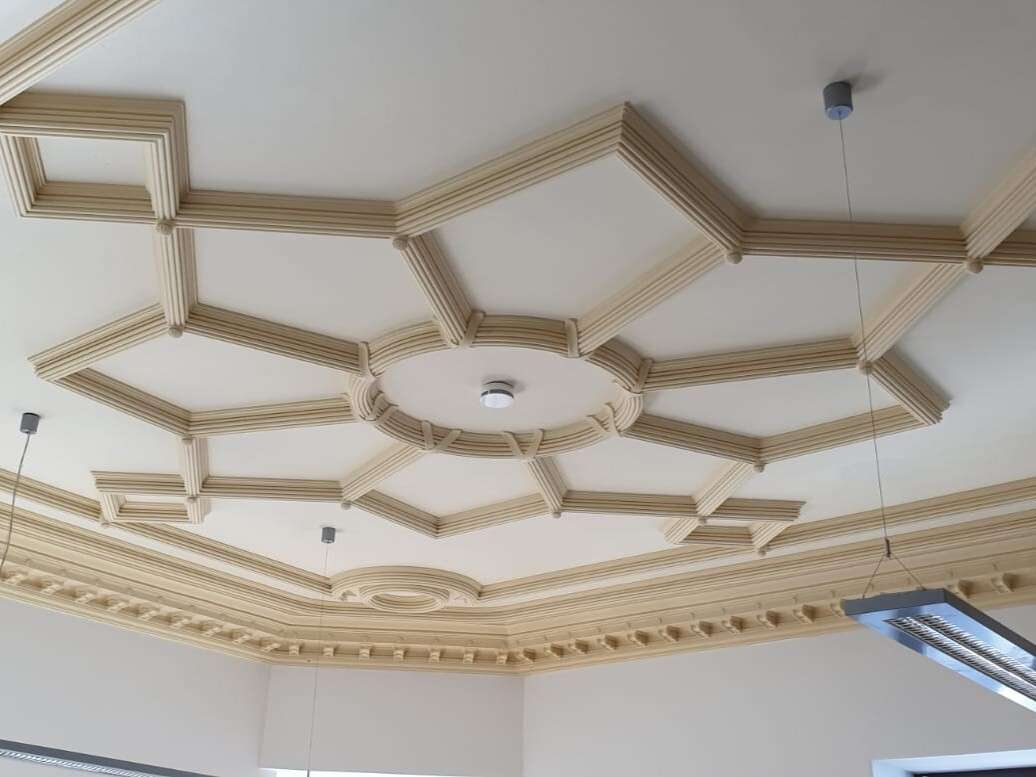 – Kassettendecken, Wandverkleidungen aus Eichenholz, dekorativer Innenstuck