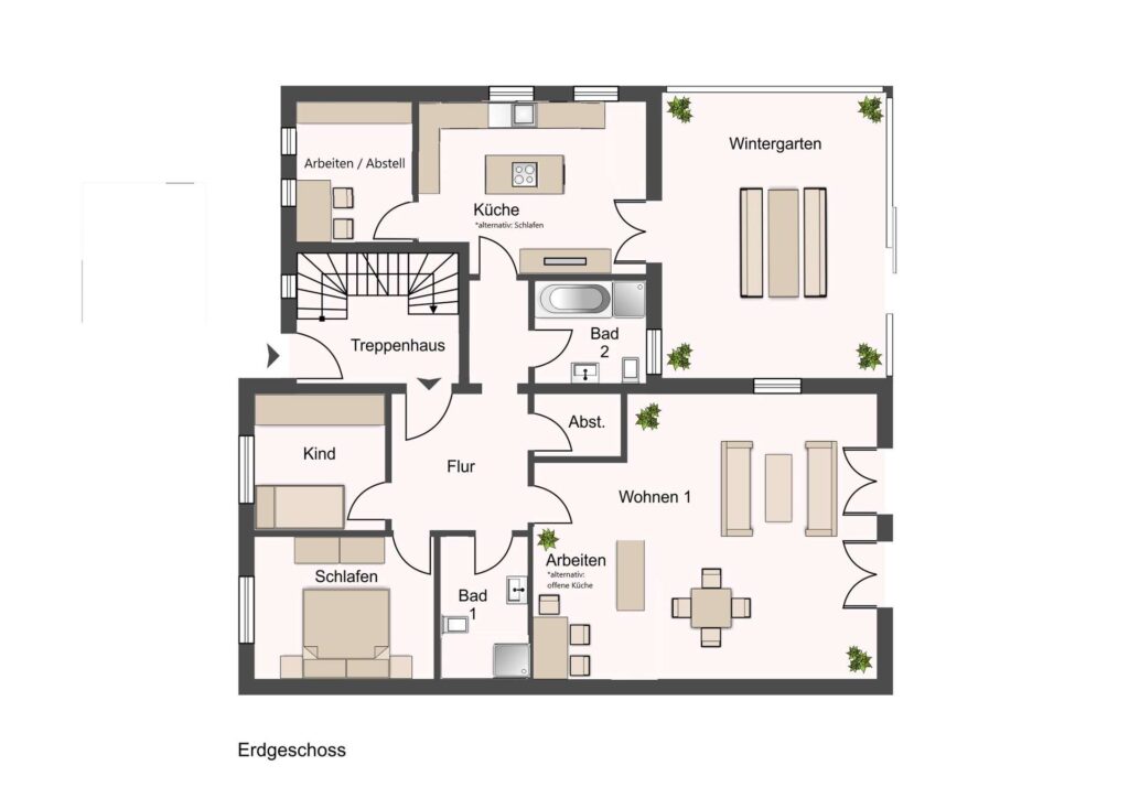 Die Erdgeschosswohnung ist das Herzstück des Hauses: Auf ca. 174 m² verteilen sich vier großzügige Zimmer, zwei moderne Bäder sowie ein über 30 m² großer, verglaster Wintergarten mit Fußbodenheizung. Von hier aus gelangen Sie direkt auf die weitläufige Terrasse und in den traumhaften Garten. Das Hauptbad wurde 2019 hochwertig modernisiert. Die offene und durchdachte Raumaufteilung lässt auf Wunsch auch eine Umgestaltung in eine 6-Zimmer-Wohnung zu.