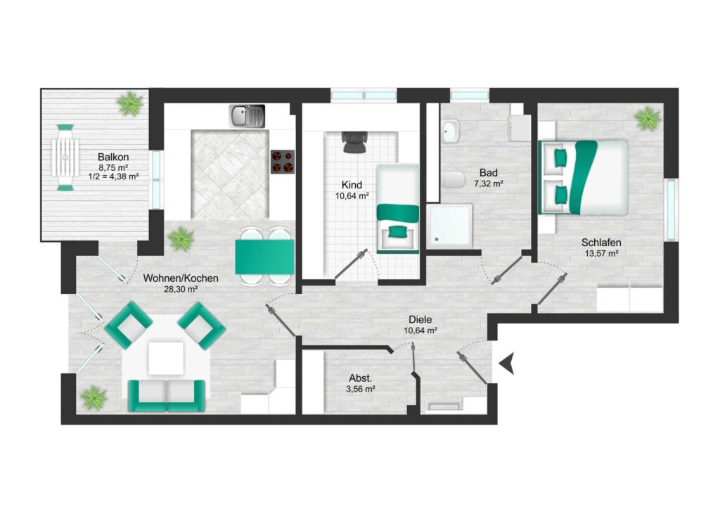 Der offen gestaltete Wohn-, Ess- und Küchenbereich bildet den Mittelpunkt der Wohnung. Große Fensterflächen sorgen für eine helle, freundliche Stimmung und führen auf den Balkon. Neben dem Wohnbereich stehen ein Schlafzimmer sowie ein weiteres Zimmer zur Verfügung, das flexibel als Kinder-, Gäste- oder Homeoffice-Zimmer genutzt werden kann. Der klar strukturierte Grundriss wird durch eine zentral gelegene Diele, einen separaten Abstellraum und kurze Wege optimal ergänzt.